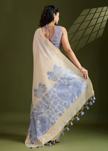 The subtle cream base with woven self-checks adds a layer of quiet sophistication, perfect for formal events, poojas, or festive luncheons. The contrasting purple blouse in matching Muga cotton brings a regal flair, offering a balanced, coordinated look that stands out effortlessly. The Kalamkari pallu becomes the centrepiece, narrating stories through intricate, hand-drawn designs inspired by tradition.