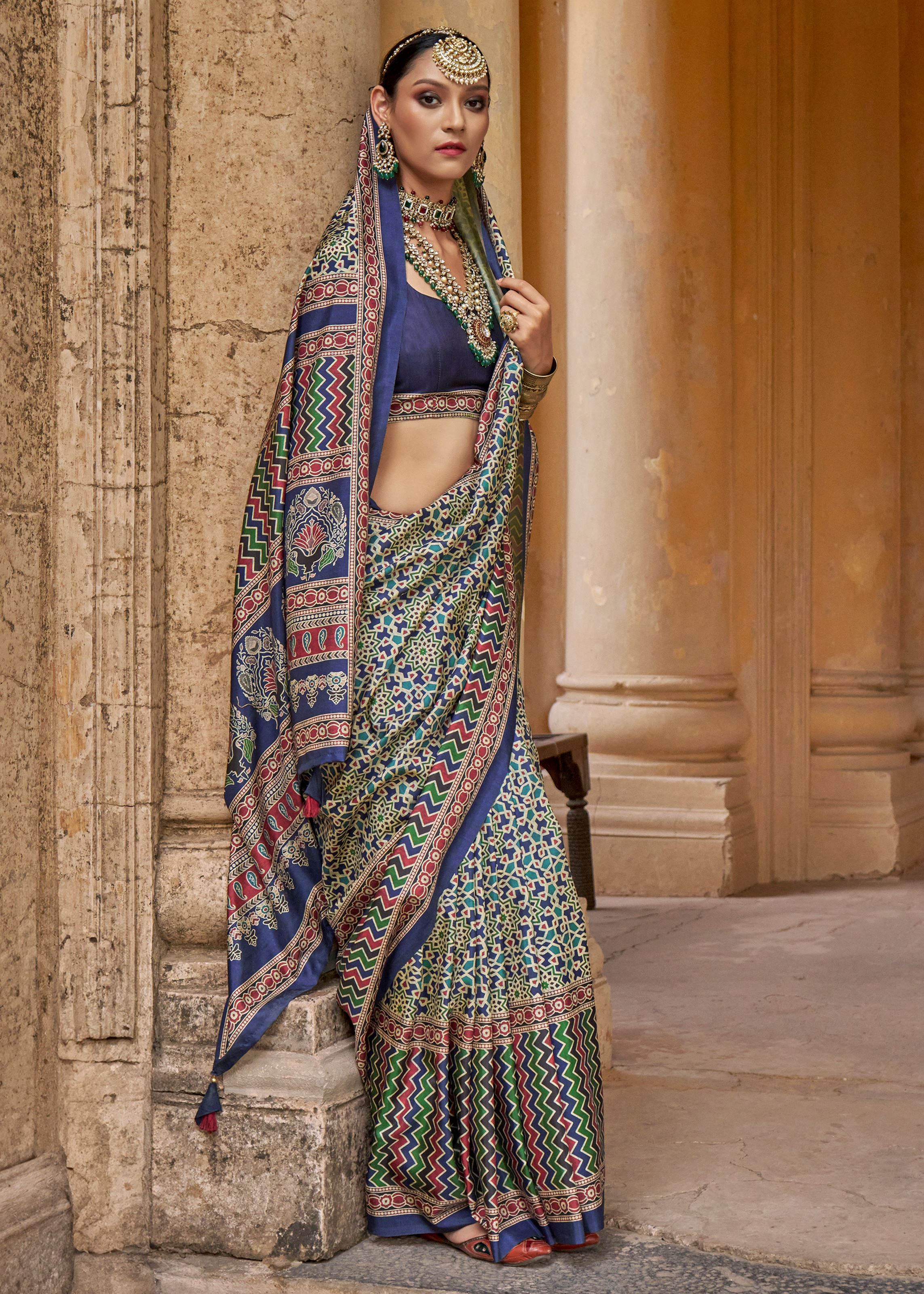 Blue Multicolor PV Silk Saree with Ajrakh Print and Croma Finish