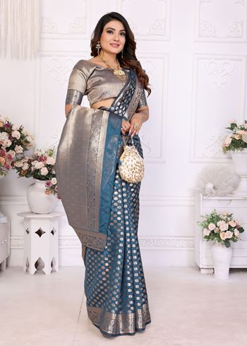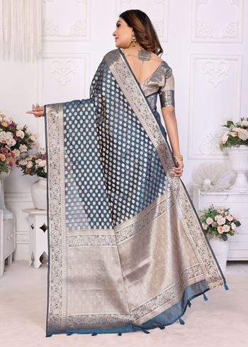 The deep blue shade symbolizes grace and sophistication, while the exquisite gold zari woven work enhances the saree with a royal charm. Each motif is delicately woven, reflecting skilled craftsmanship and artistry that speaks of heritage and grandeur. The shimmer of zari against the soft blue base creates a striking balance, offering a regal yet contemporary look that is perfect for women who love to make a statement.