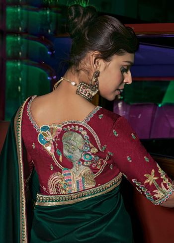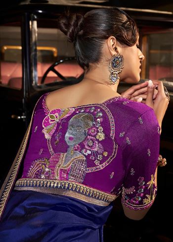 Paired with a magenta pure silk blouse featuring delicate embroidery, this combination creates a striking contrast that highlights the deep blue hue of the saree. The smooth, flowing silk drapes effortlessly, offering a graceful silhouette that ensures comfort and elegance for extended wear. Ideal for bridal functions, parties, or traditional gatherings, this saree guarantees a polished and stylish appearance.