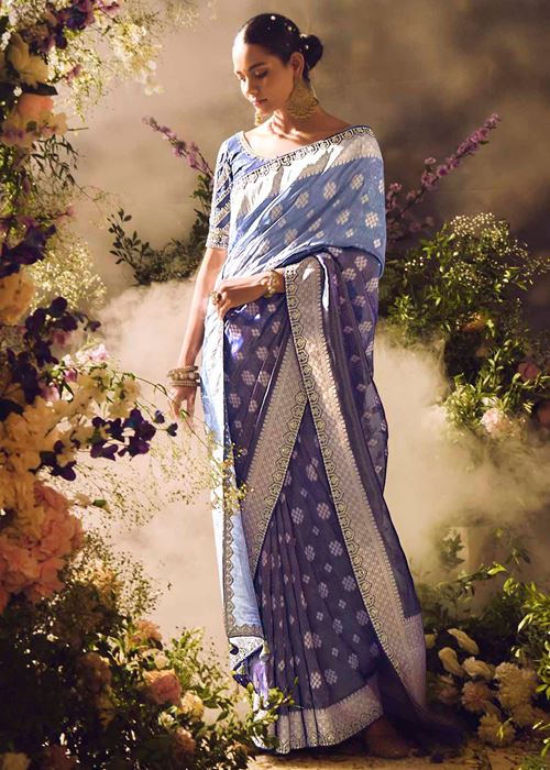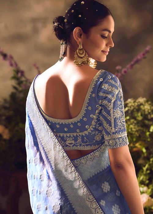 Blue Saree With Jacquard Woven Work with Embroidered Lace Border