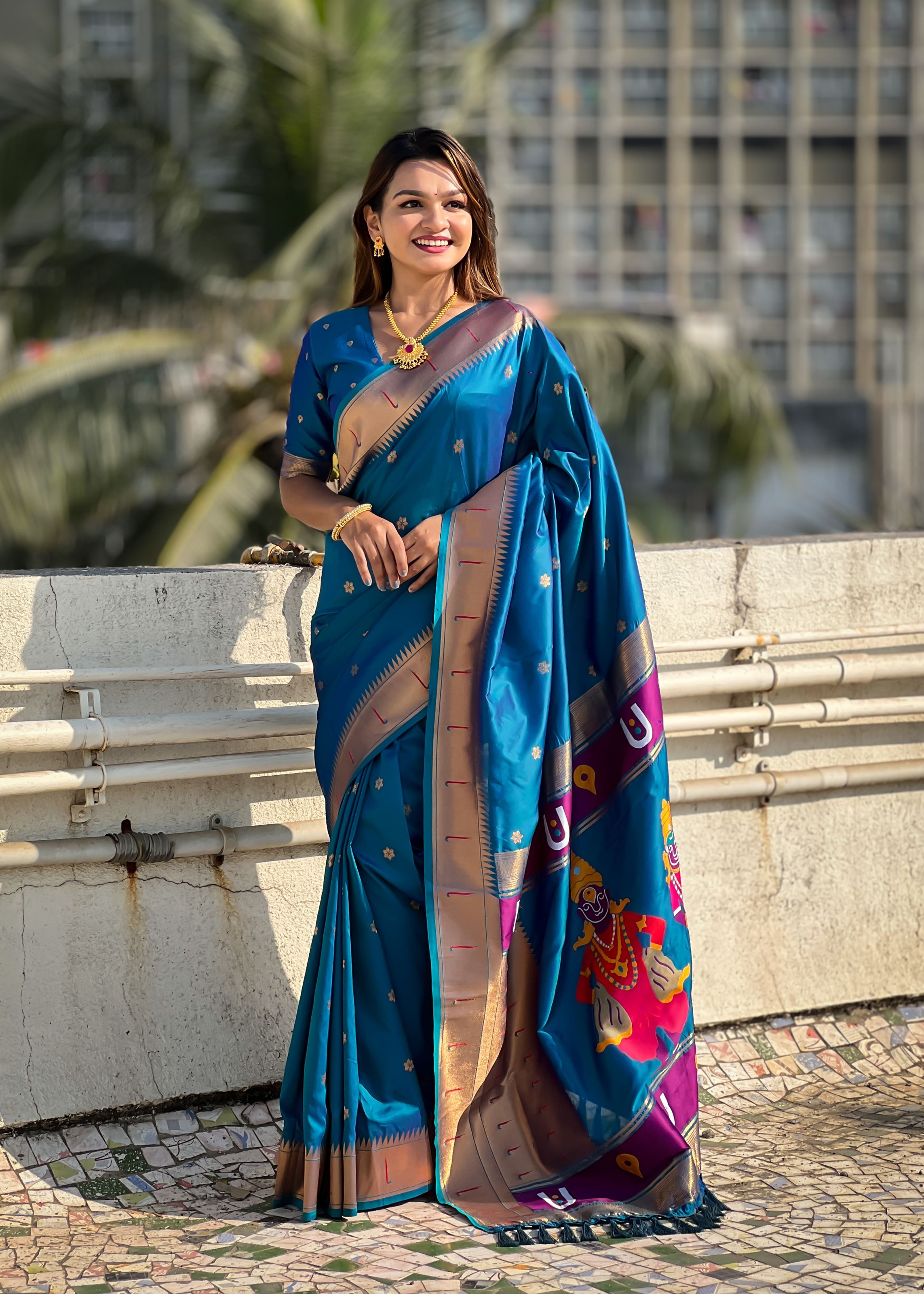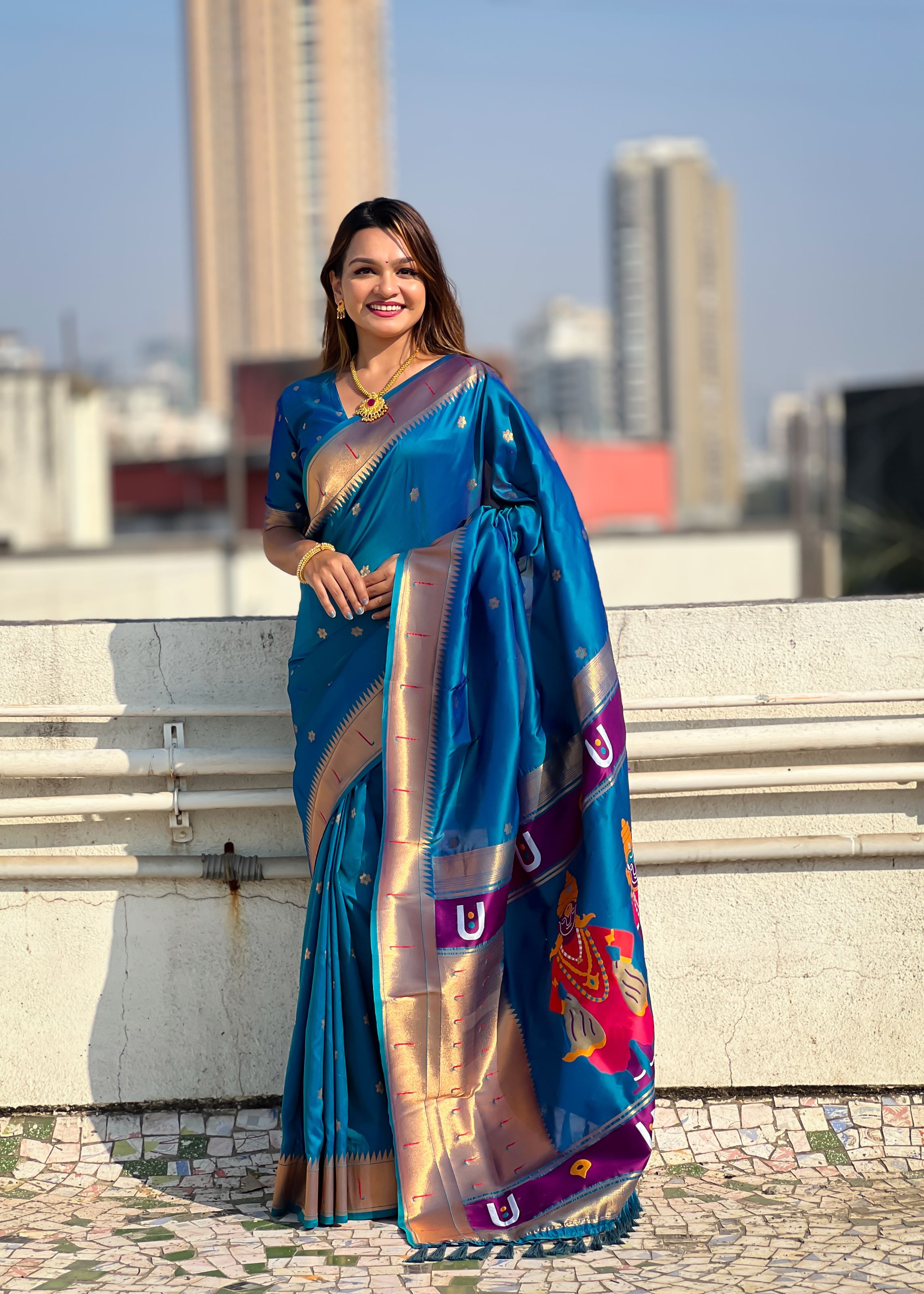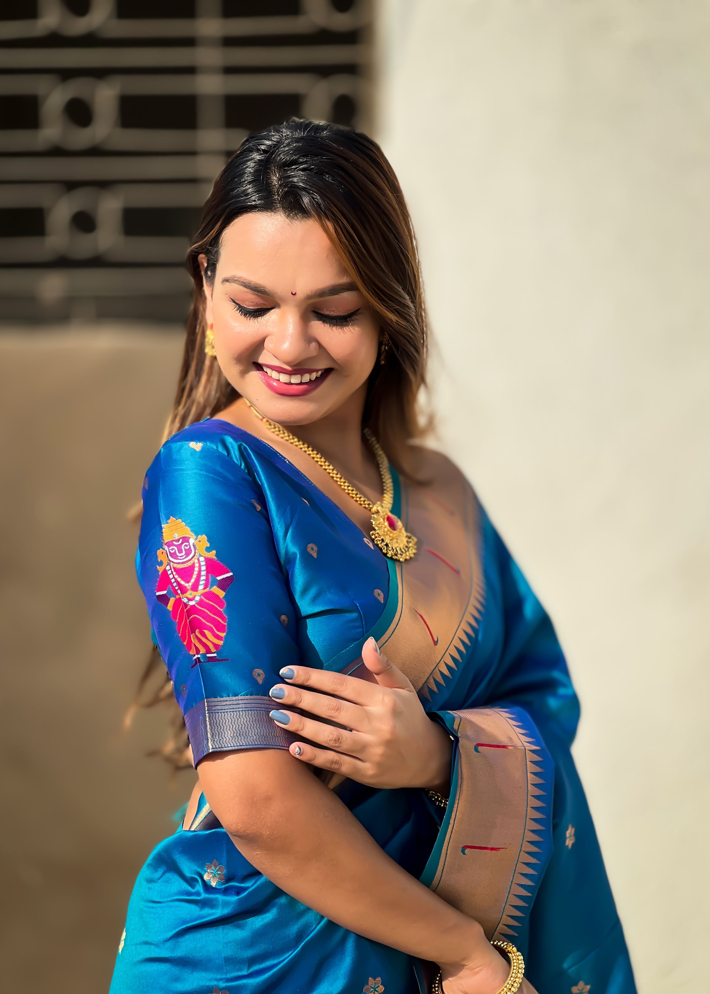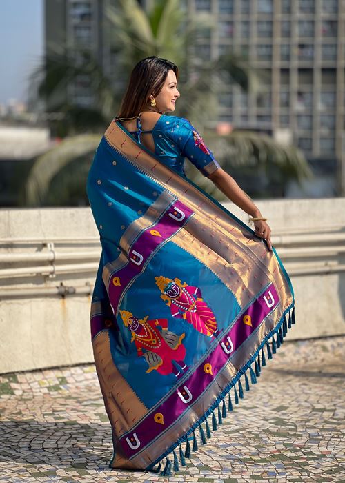 Blue Silk Blend Vitthala God Paithani Silk Saree