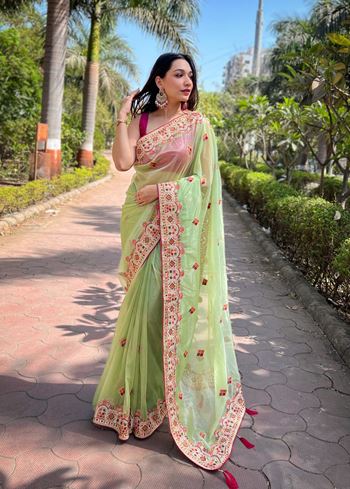 The saree features heavy embroidery throughout, highlighting meticulous craftsmanship and intricate design. The contrasting pink art silk blouse enhances the overall appeal, creating a stylish and coordinated look. Each detail is thoughtfully designed to merge traditional artistry with contemporary fashion, making it a standout piece for women seeking designer ethnic wear.