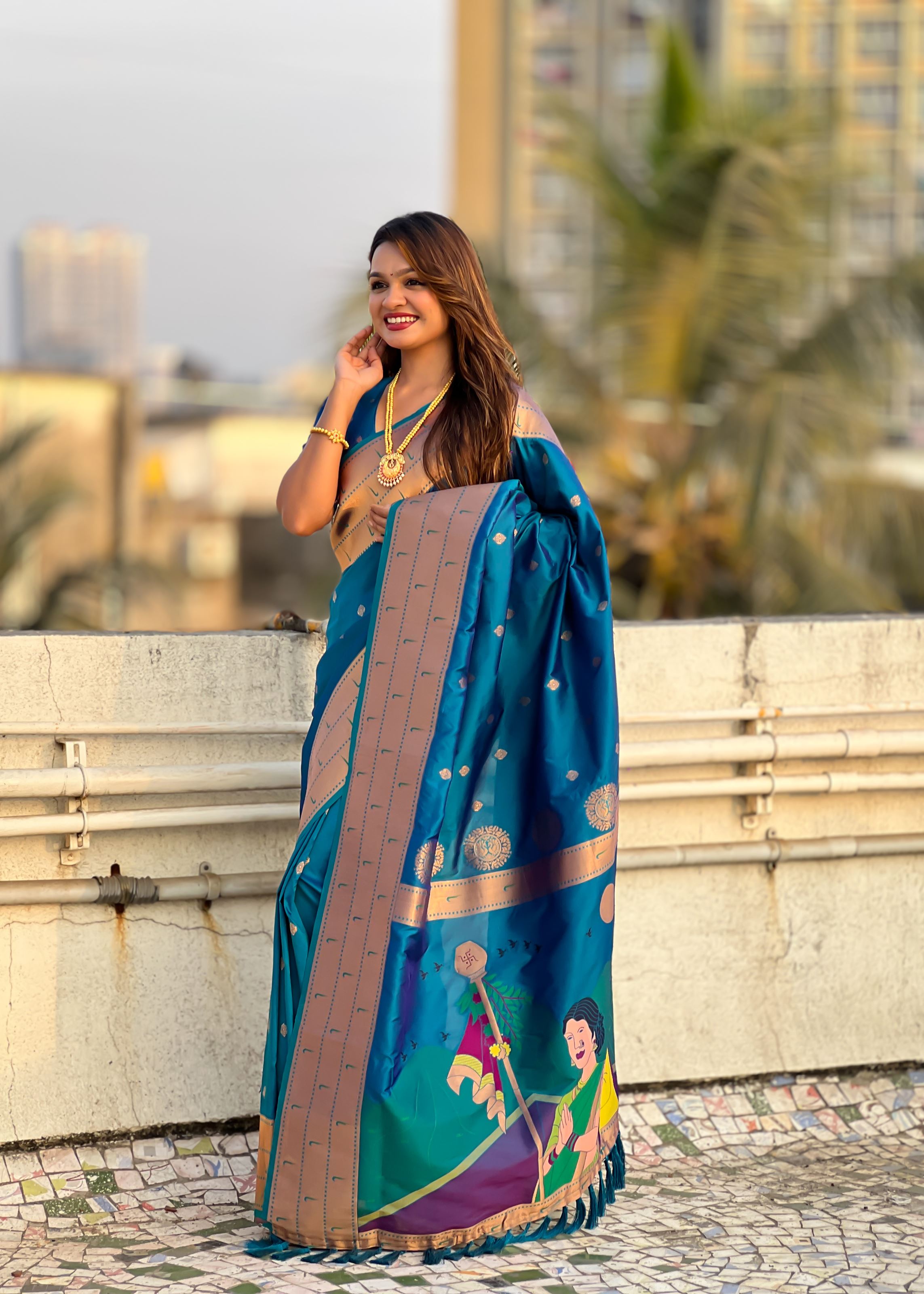 Blue Soft Silk Weaving Figure Pallu Designer Ceremonial Saree