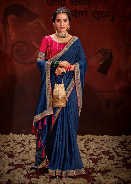 Blue Vichitra Silk Saree With Heavy Diamond Work and Embroidery Lace Border