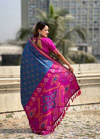 Step into elegance with the Blue Woven Meenakari Ikkat Designer Patola Silk Ceremonial Saree from Aethnofit Fashions. Made from premium Patola silk, this saree features intricate Ikkat weaving enhanced with delicate Meenakari work, creating a luxurious and sophisticated design. The rich blue body paired with a contrasting purple silk blouse offers a striking and elegant ensemble, ideal for weddings, festive occasions, and special celebrations.