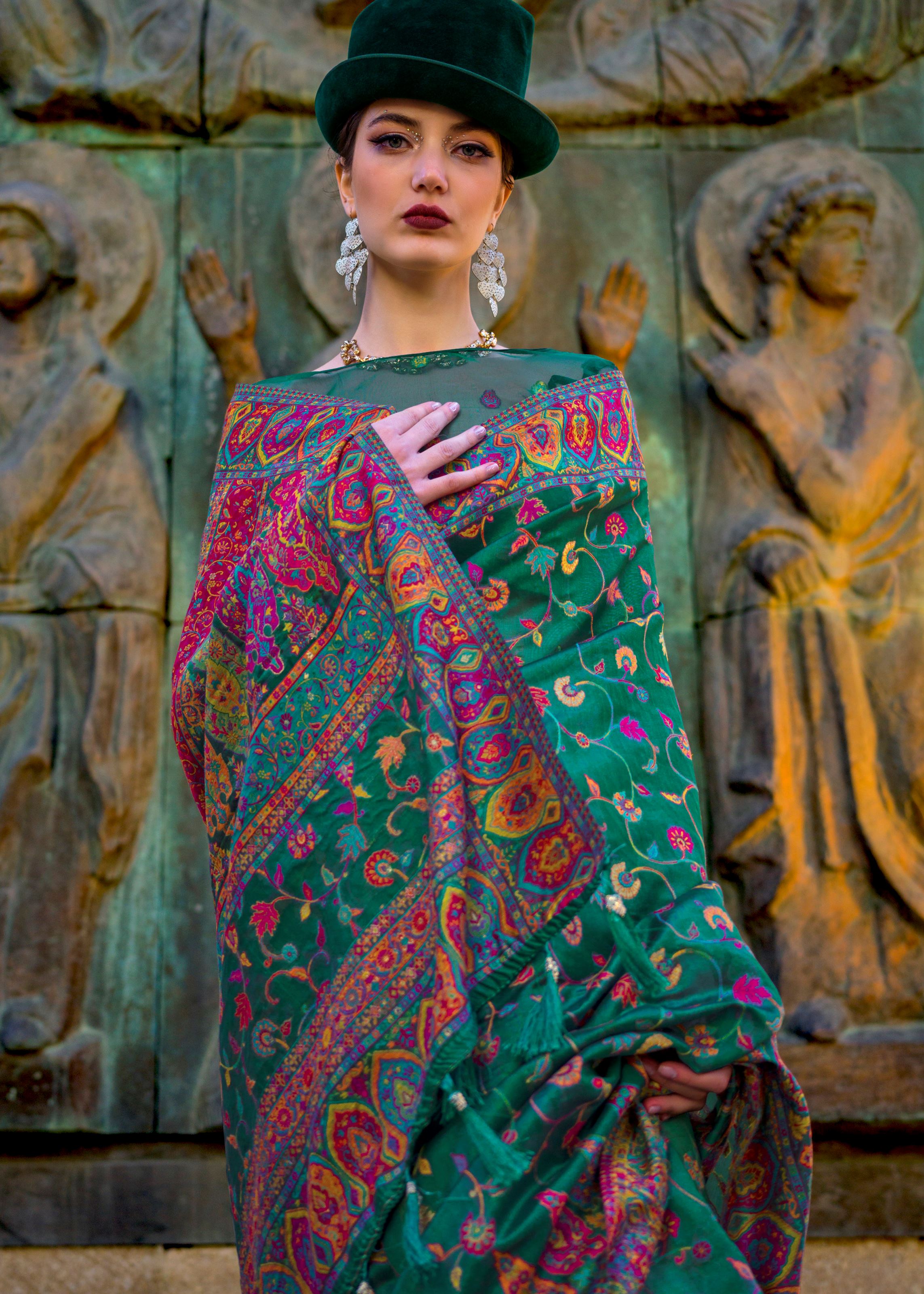 Bottel Green Handloom Organza Saree With Handloom Kashmiri Jacquard Woven Work