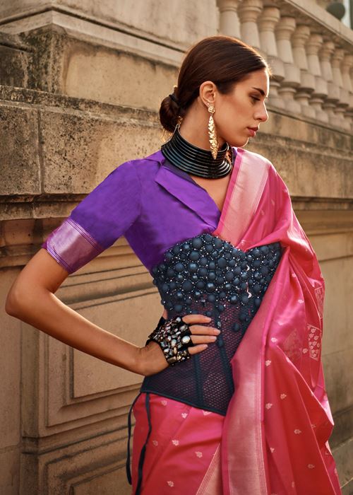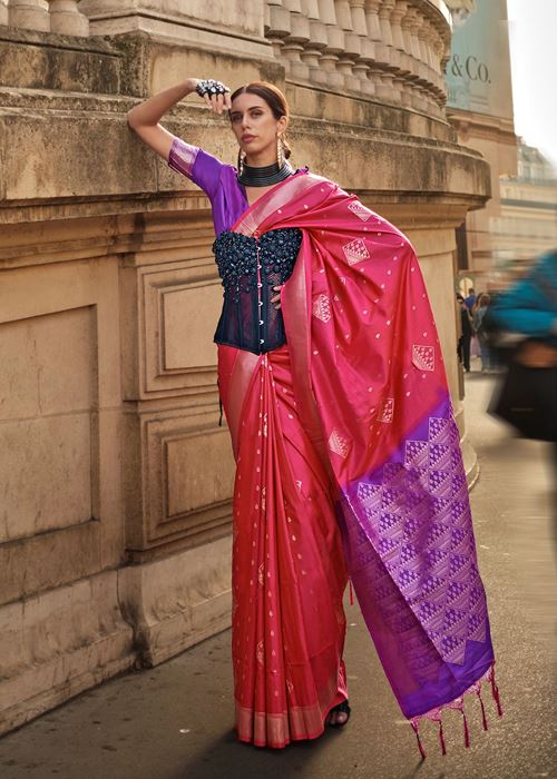 Bright Pink Soft Silk Handloom Saree With Woven Work