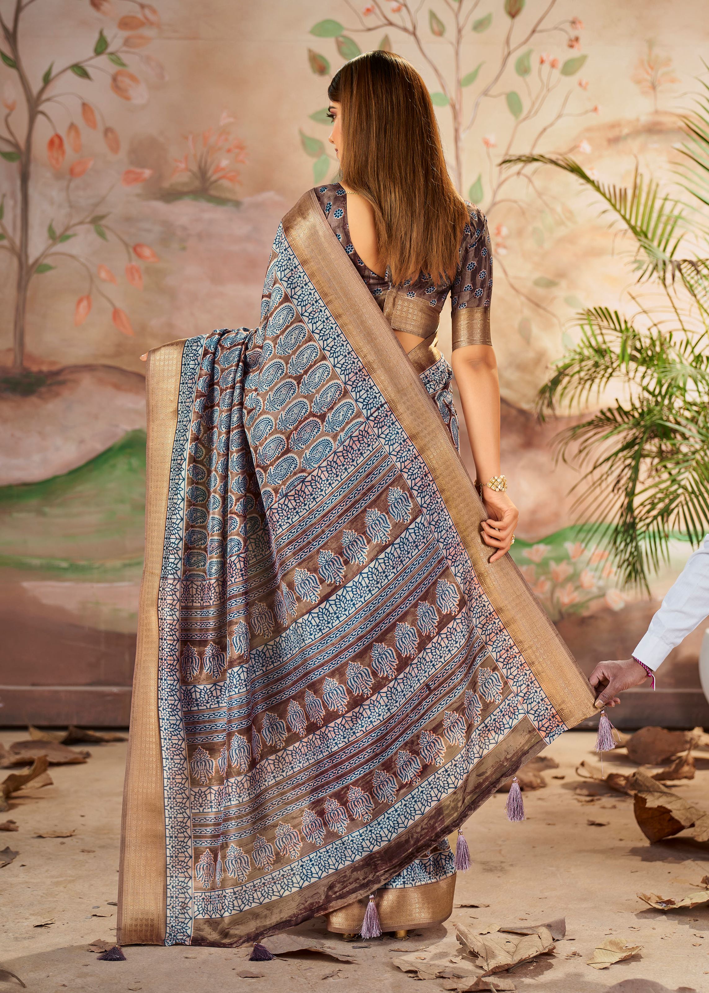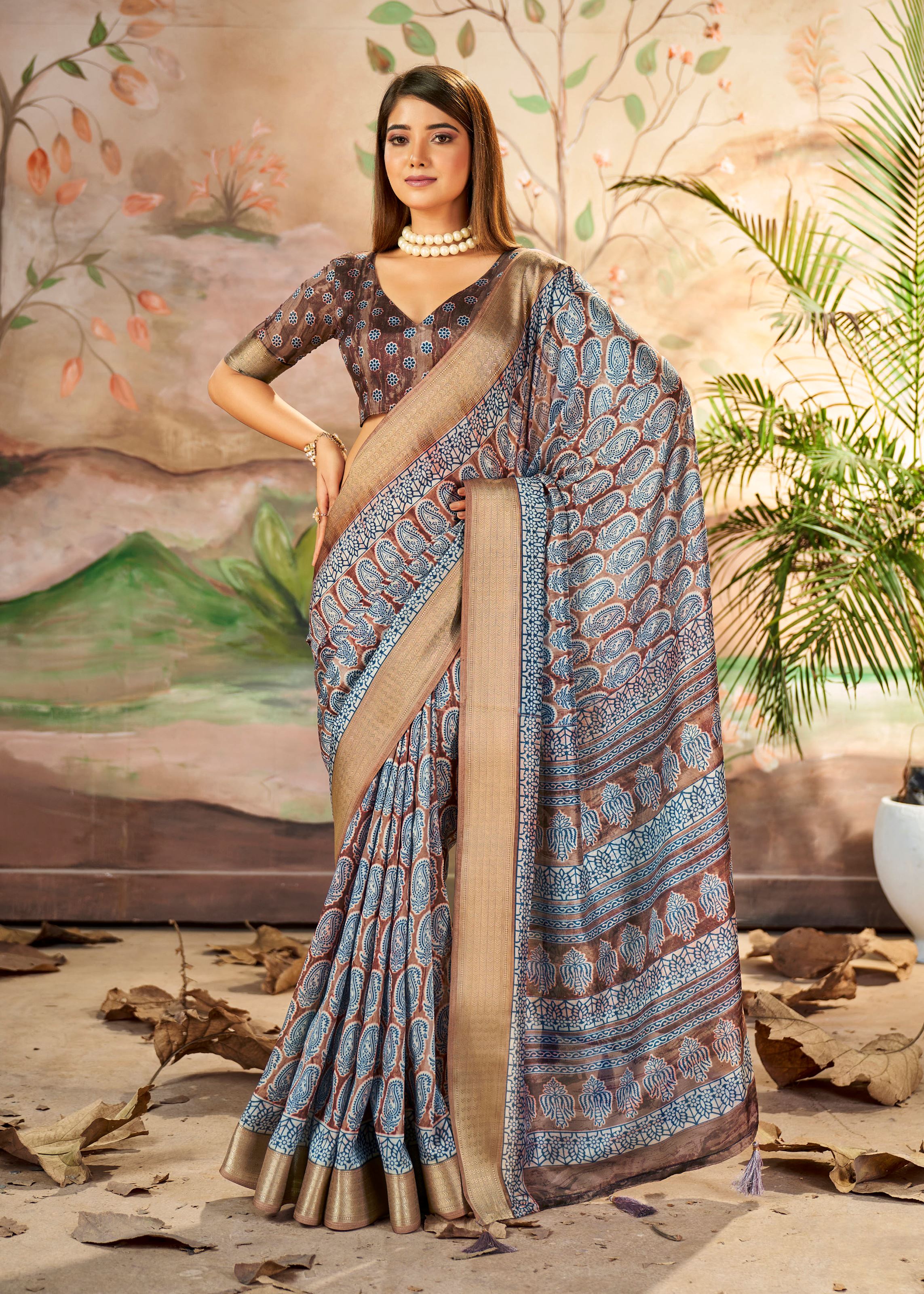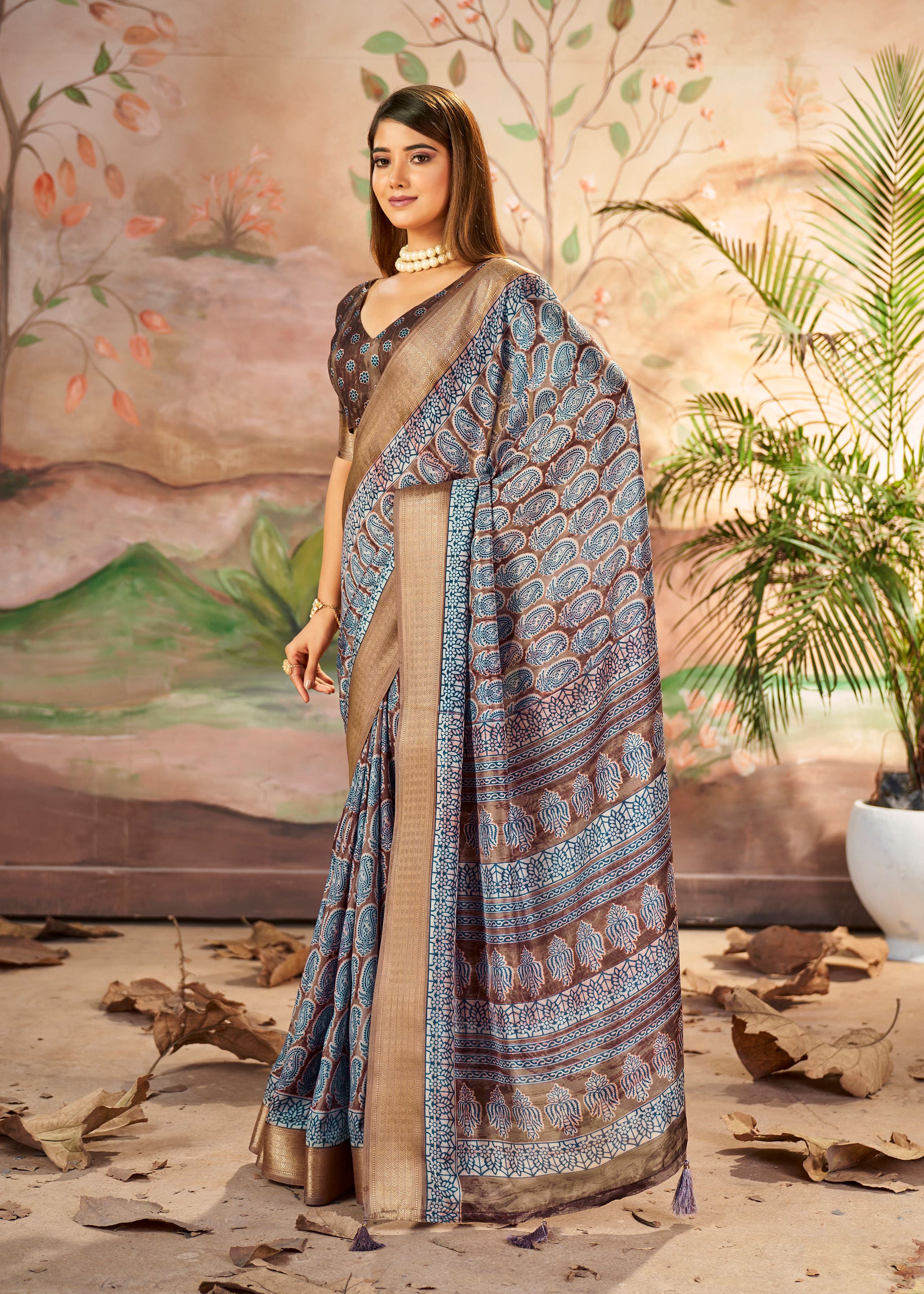 This designer saree is paired with a matching brown art silk blouse, completing the ensemble with effortless grace. The lightweight texture ensures comfort while maintaining a regal appearance. The woven border work reflects timeless craftsmanship, while the printed patterns add versatility—allowing the saree to be styled elegantly for both daytime gatherings and evening functions. Whether accessorized minimally or paired with bold jewelry, this saree adapts seamlessly to your fashion preferences.