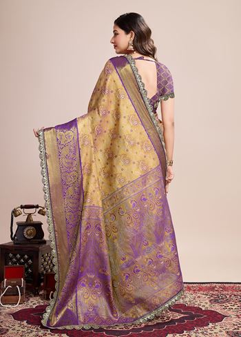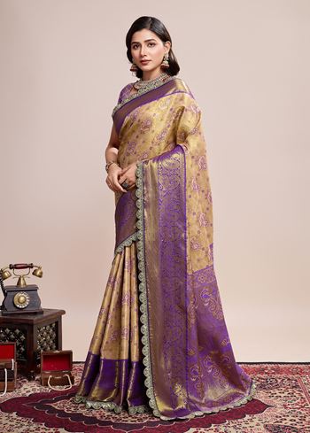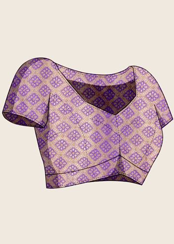 The rich brown base adorned with intricate woven jari work reflects classic Indian craftsmanship, giving the saree a royal touch. Paired with a lavender silk blend blouse, the color contrast adds a refreshing modern appeal while maintaining its ethnic charm. The woven detailing enhances its grandeur, making it a perfect choice for women who appreciate traditional artistry with contemporary finesse.