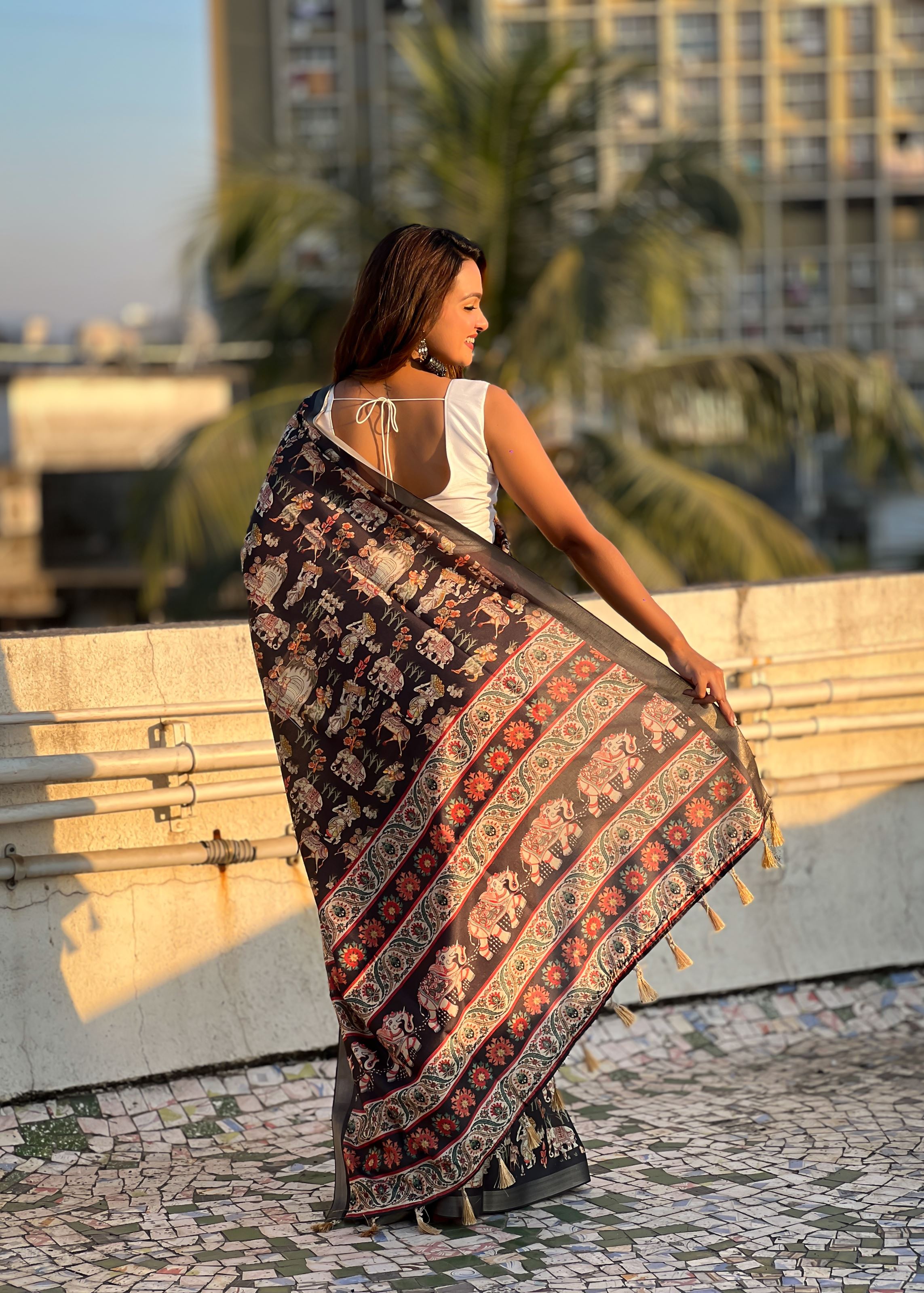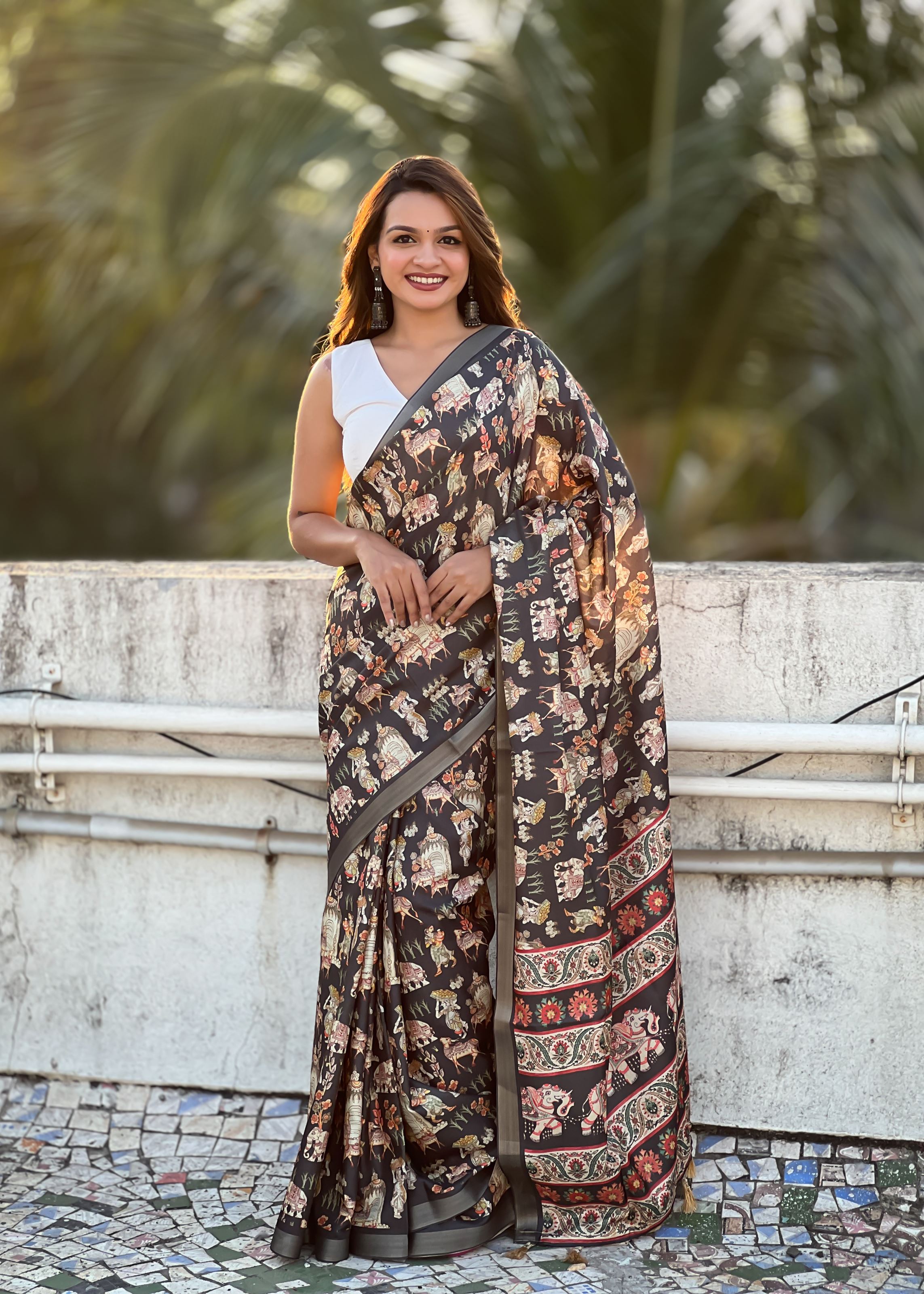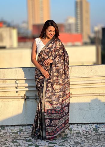 Paired with a matching brown silk blouse, this saree ensures a coordinated and polished appearance. The soft, drapable tussar silk fabric allows effortless styling while maintaining all-day comfort. Pair it with statement jewelry, elegant heels, and ethnic accessories to create a festive-ready and eye-catching ensemble. Designed for women who appreciate authentic silk craftsmanship, this saree offers elegance, versatility, and timeless charm for every occasion.