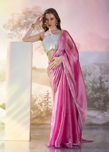 Paired with a matching brown art silk blouse, the ensemble creates a seamless, elegant look. The blouse’s luxurious texture and soft sheen complement the airy organza, ensuring a refined and stylish appearance. Perfect for women seeking Bollywood-inspired partywear sarees or trendy ethnic fashion, this saree combines traditional artistry with contemporary design, making it a versatile wardrobe essential.