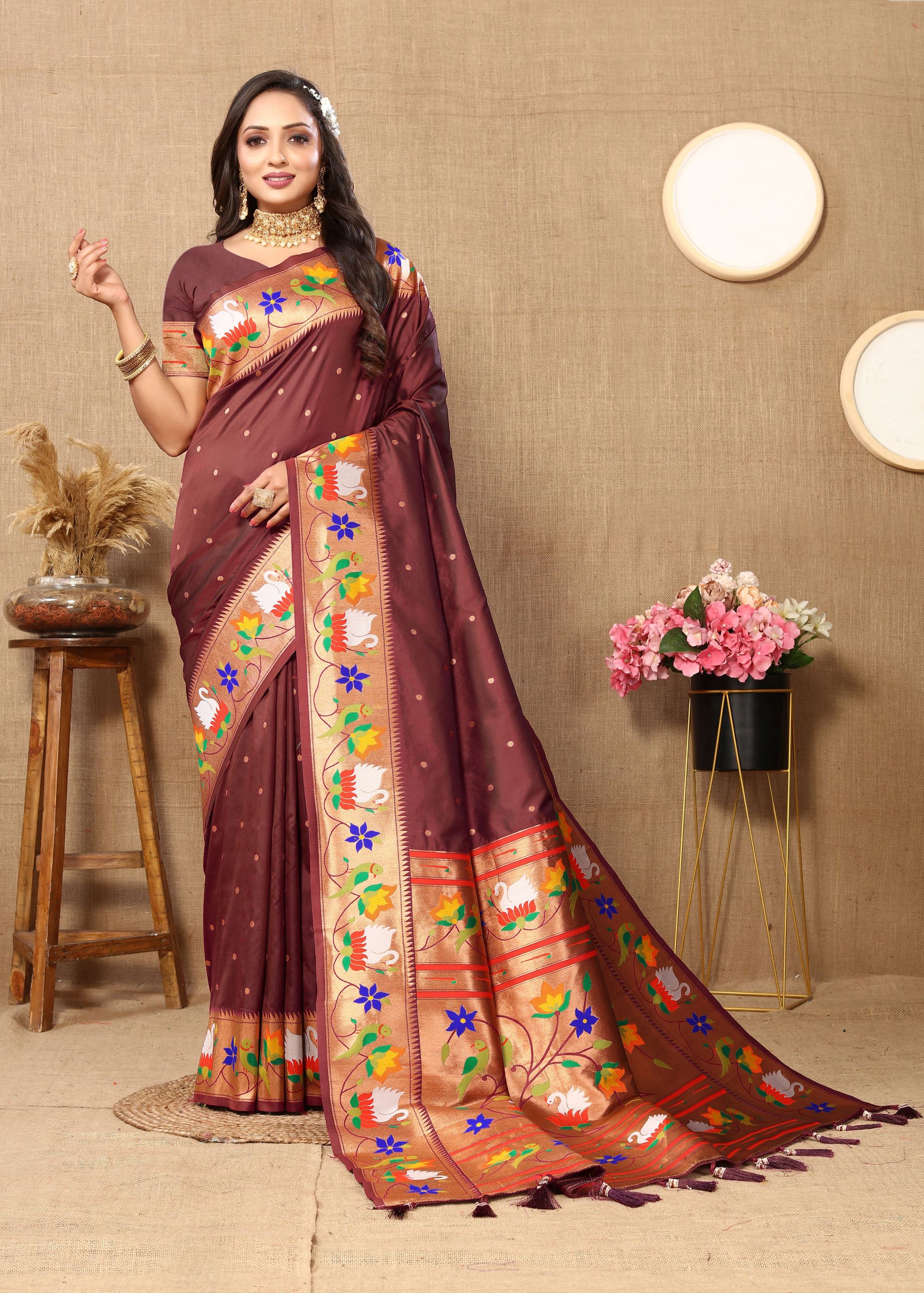 This saree is paired with a matching brown silk blend blouse, allowing you to create a coordinated, graceful look. Style it with traditional gold jewelry, a Paithani-inspired hairstyle, and statement footwear for an effortlessly royal appearance.Perfect for wedding receptions, cultural festivities, and ethnic occasions, this Brown Paithani Silk Saree is not just a piece of clothing but a work of art that combines cultural heritage with luxurious elegance.