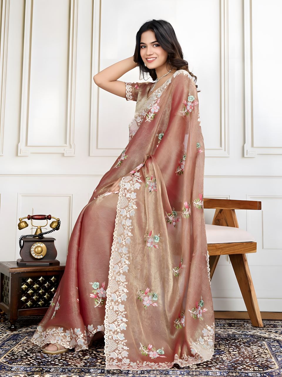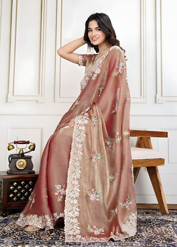 Brown Soft Crunchy silk Saree with Digital Print with Thred Sequins Embroidery Work