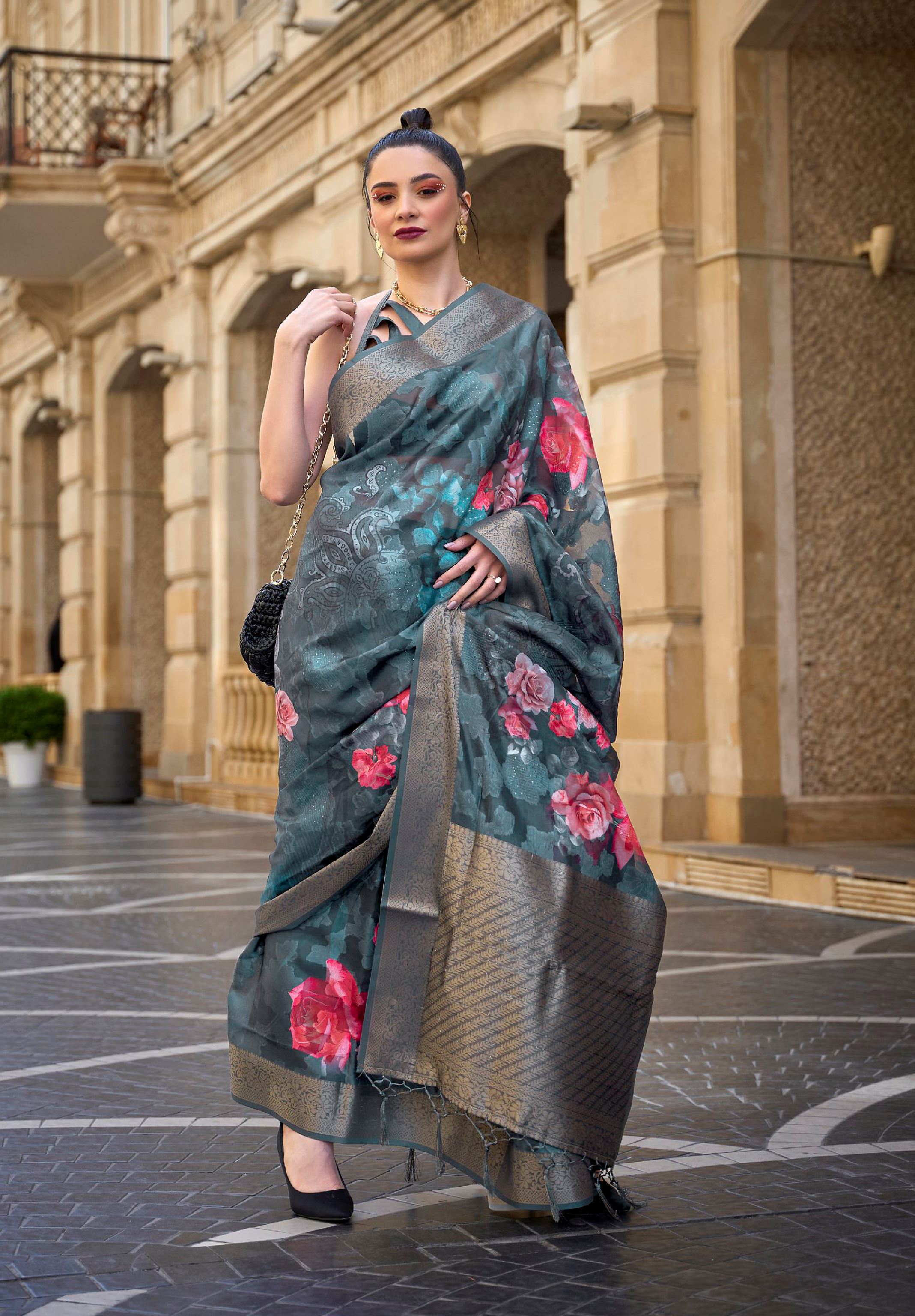 Cerulean Poly Brasso Handloom Silk Saree With Printed Poly Brasso Handloom Waving