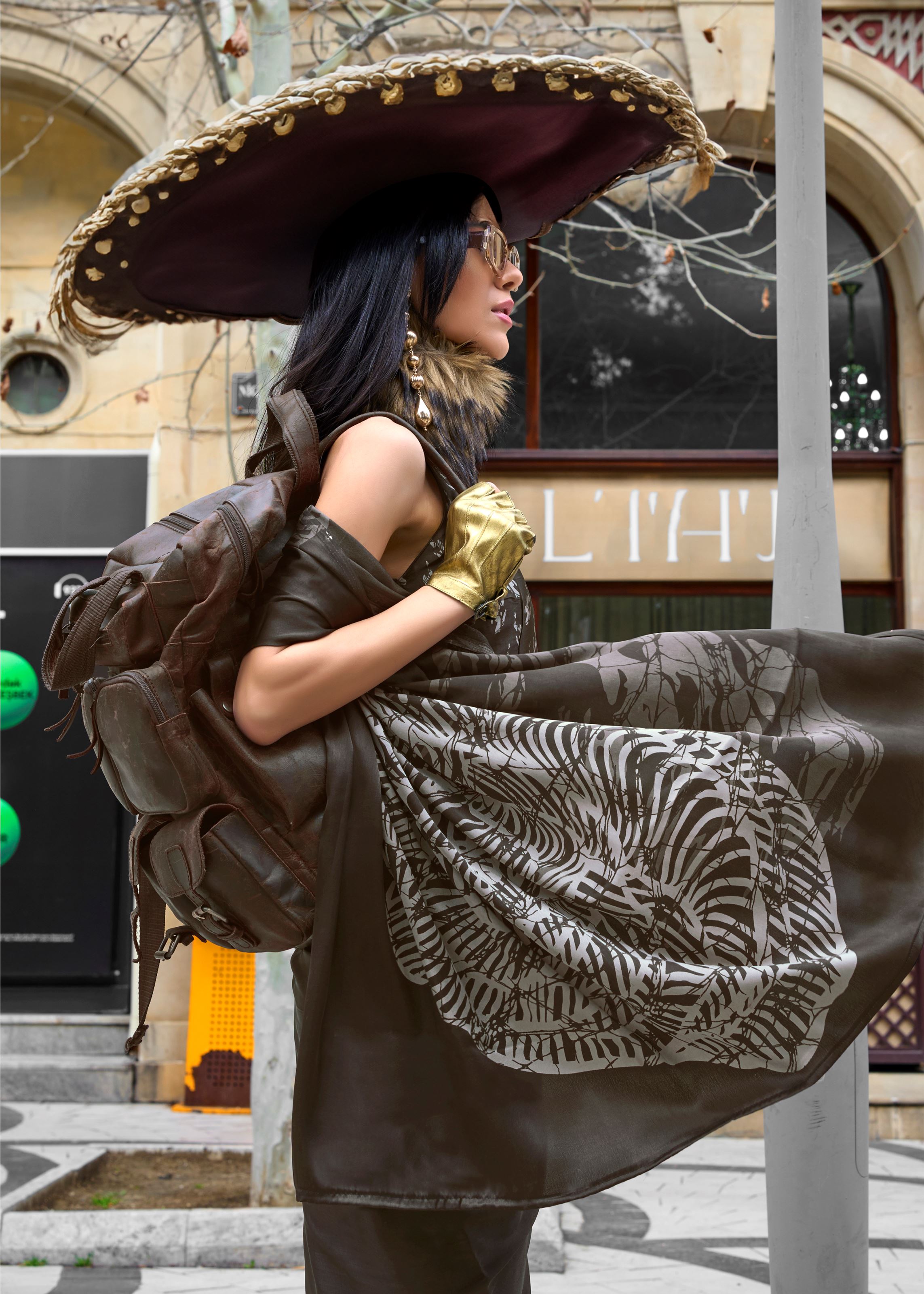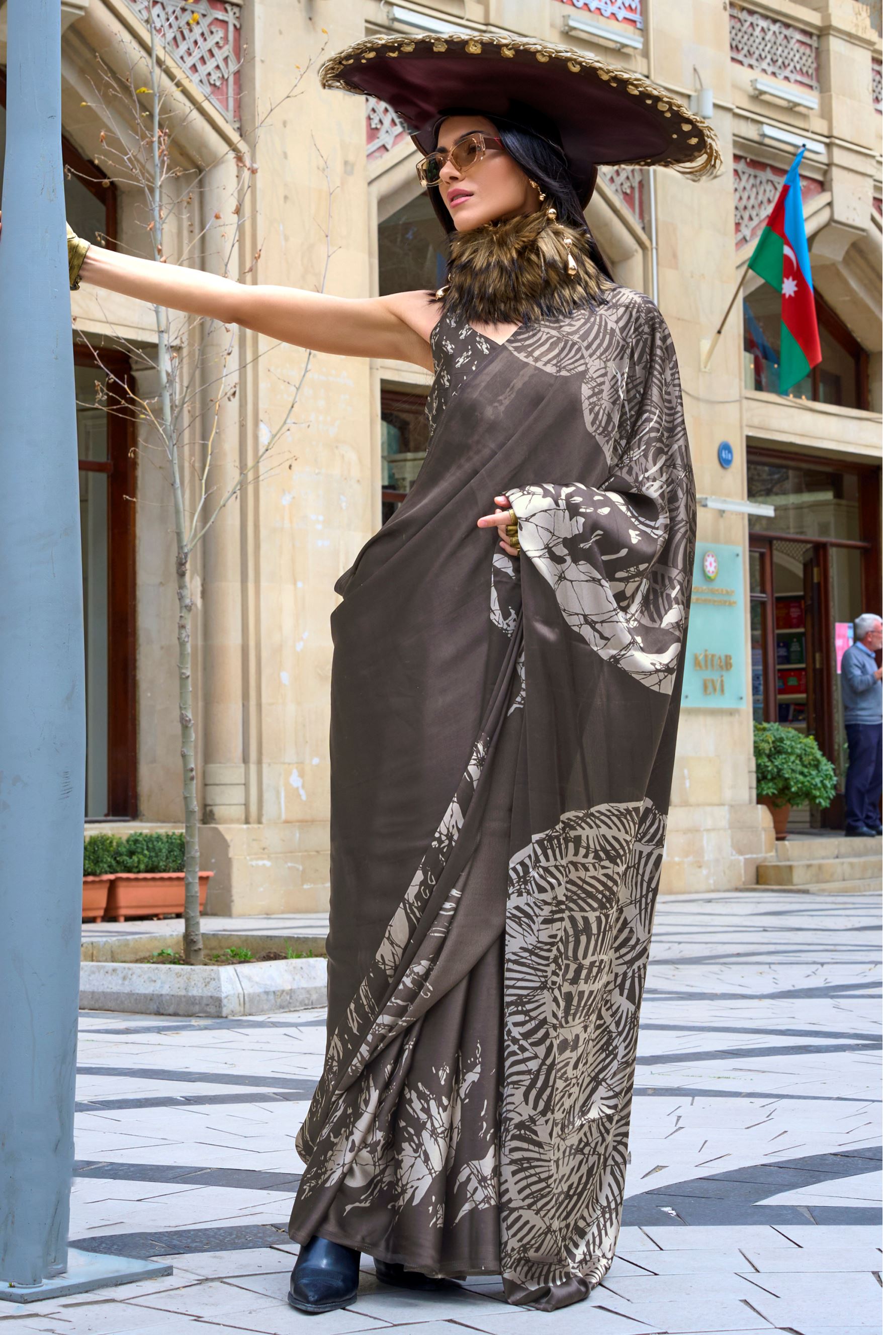 Charcoal Satin Saree With Digital Print