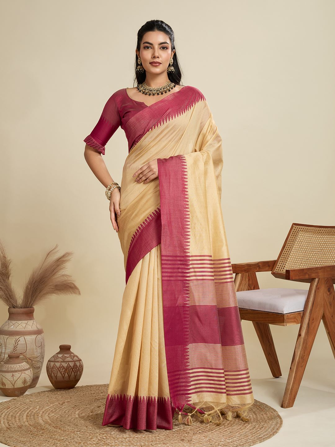 The classic temple border, inspired by age-old South Indian motifs, adds a cultural richness that pays homage to traditional craftsmanship. The saree is finished with a striped pallu, lending it a graceful, rhythmic design element that creates a balanced and eye-catching look.