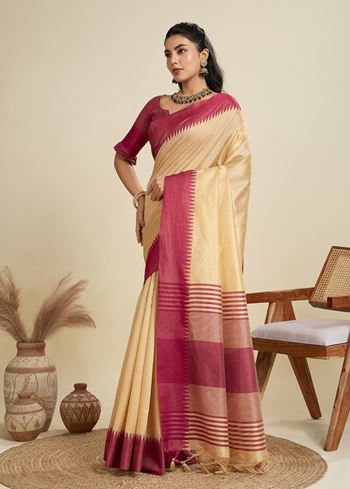 Whether draped in a traditional pleated style or a more modern silhouette, this saree promises poise and confidence. The Chiku Raw Silk Saree with Temple Border and Striped Pallu is a graceful choice for the woman who values tradition, subtle charm, and timeless elegance.