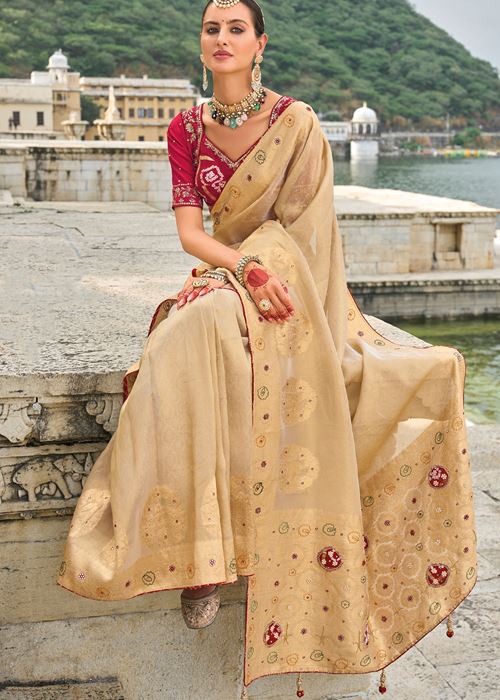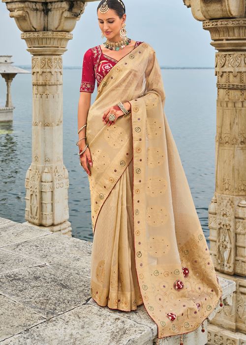 Chiku Pure Kanjivaram Saree With Zardosi, Cut-Dana With Moti Heavy Embroidery Work