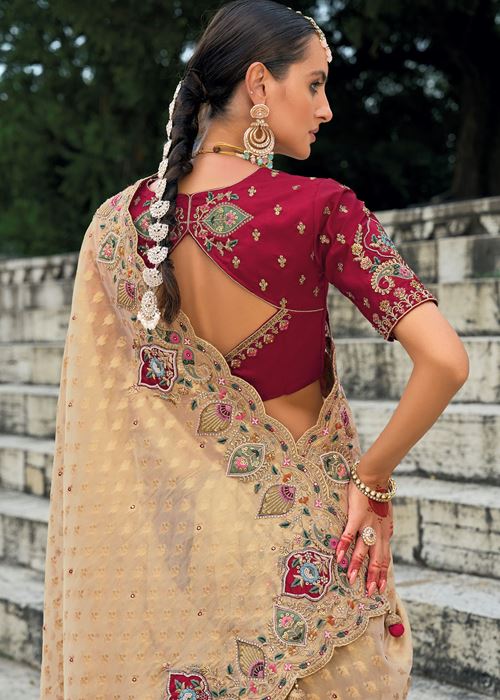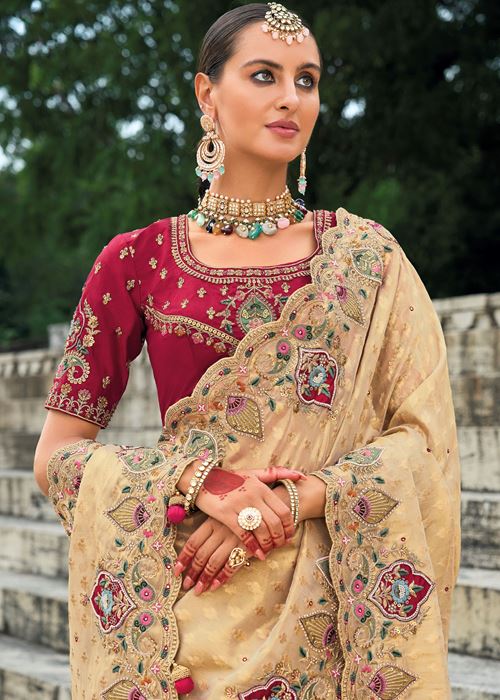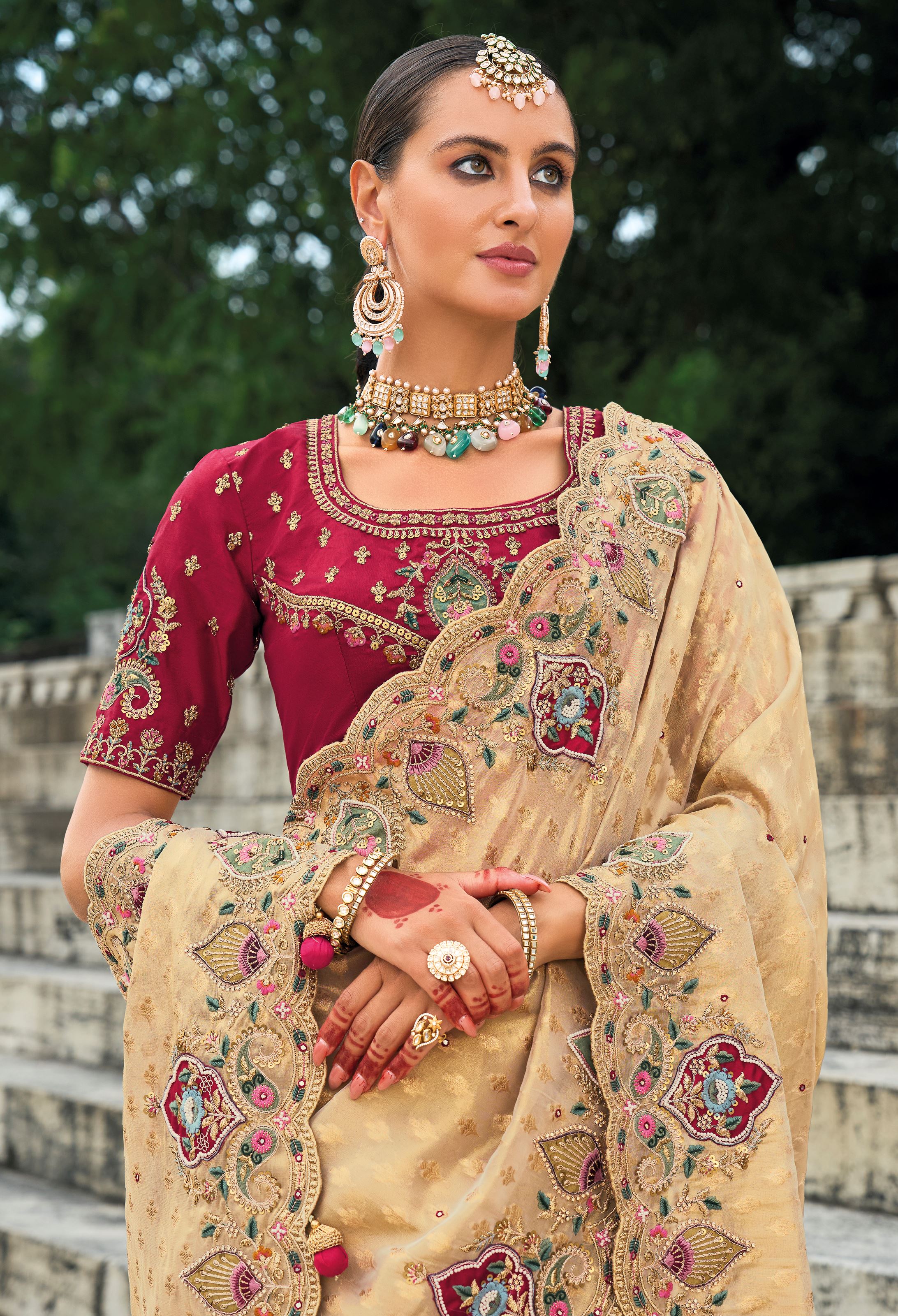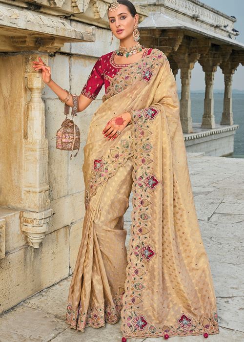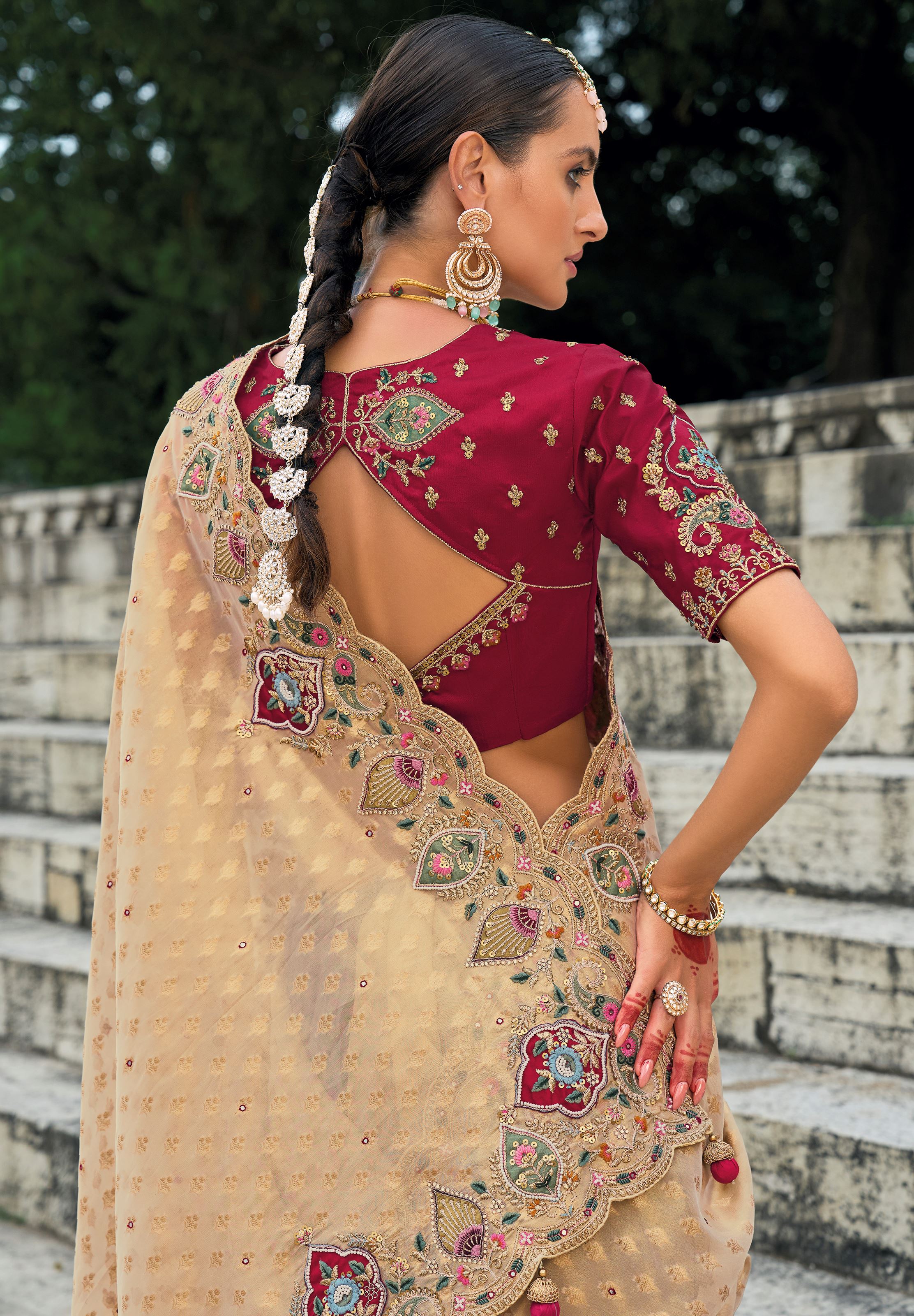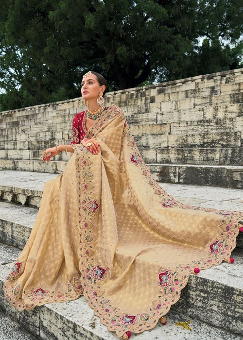 Chiku Kanjivaram Butti Saree With Thread Embroidery Zari, Moti, Mirror With Jarkhan Heavy Work