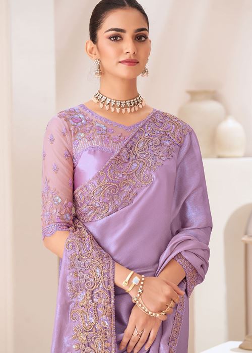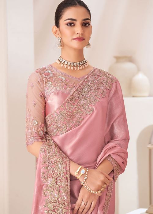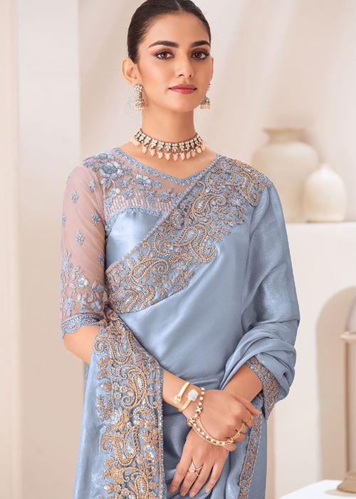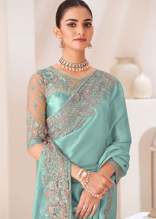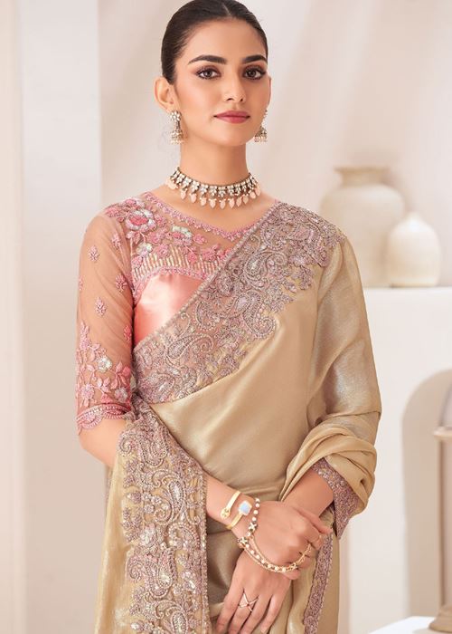 Chiku Satin Chiffon Saree With Heavy Thread Embroidery Sequins Work Lace Border Saree With Embroidery Blouse