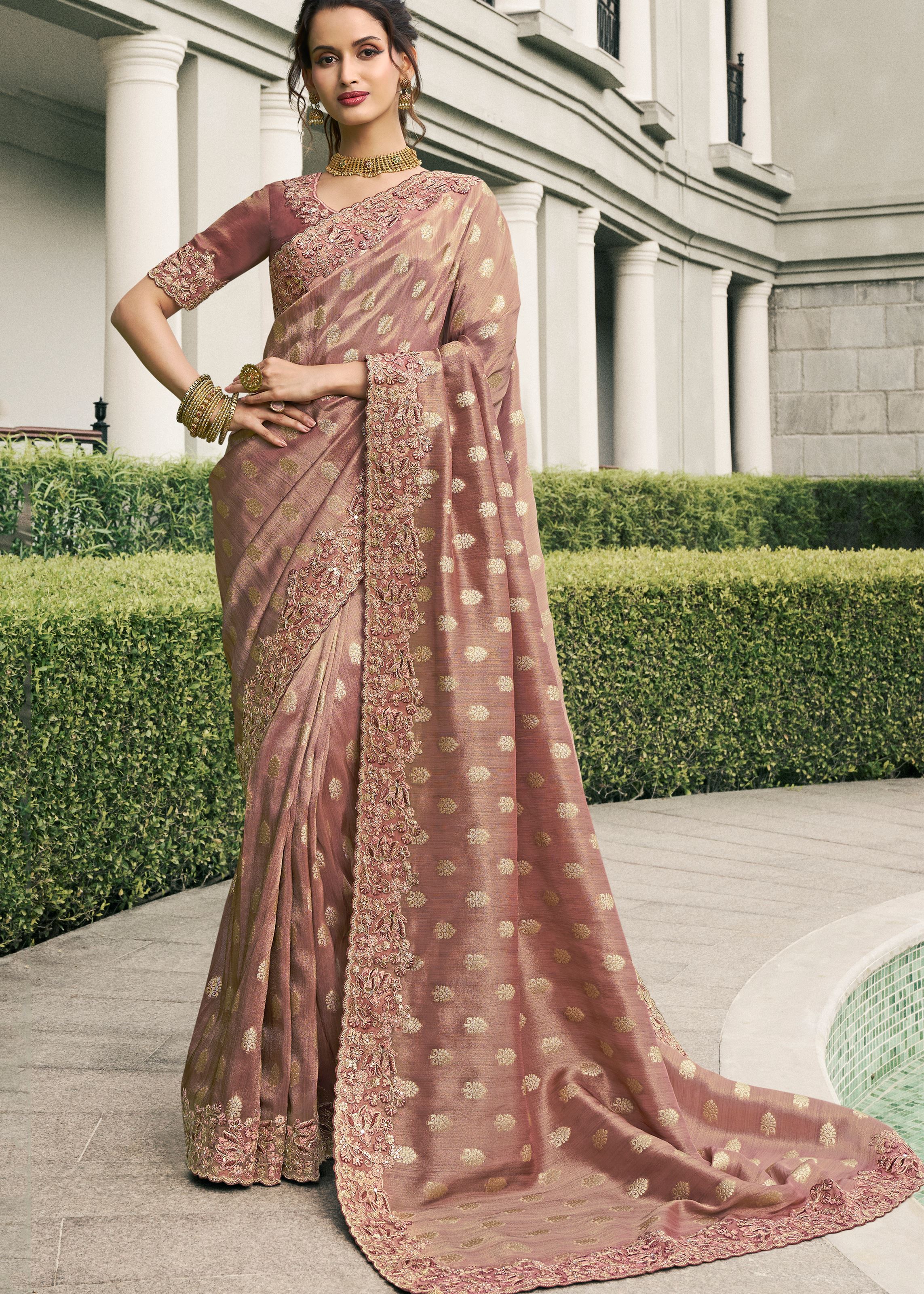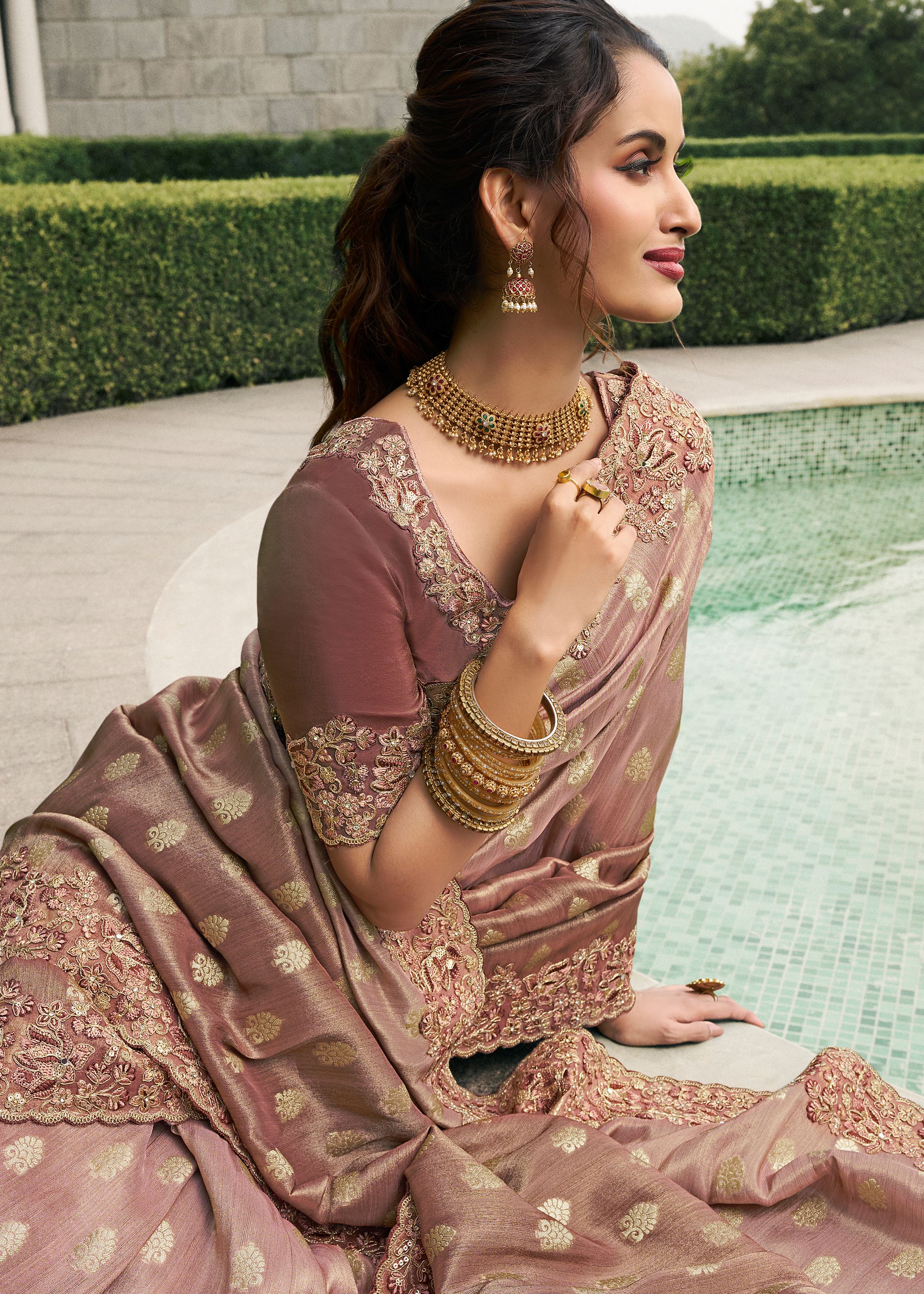 Chocolate Saree With Heavy Thread Embroidery, Stone, Pearl, Real Mirror Work