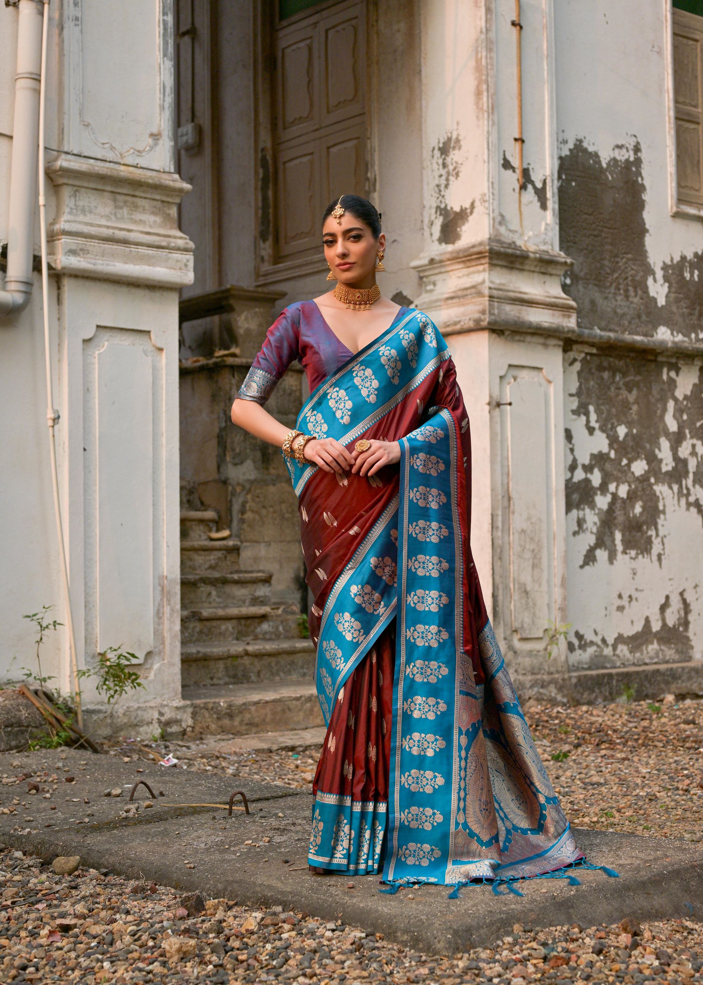 The deep coffee shade exudes sophistication and royal charm, making it a versatile choice for weddings, receptions, and cultural celebrations. Adorned with intricate zari woven patterns, this saree beautifully captures the artistry of traditional weaving. The shimmering zari work enhances its heavy ceremonial appeal, giving you a rich, majestic presence while maintaining an elegant balance.