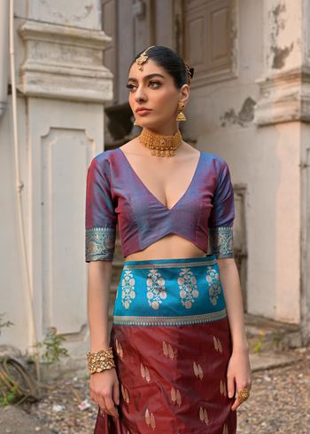 It is paired with a contrasting blue silk blend blouse, which adds a striking vibrancy to the overall ensemble. This thoughtful color contrast elevates the saree’s charm, making it a true standout piece in any gathering. Lightweight yet grand in appearance, it ensures ease of wear throughout long festive hours without compromising on style.Pair this saree with traditional kundan or gold jewelry, ornate bangles, and embellished footwear to complete your ceremonial look. A symbol of heritage and grace, this Banarasi saree is a must-have for women who wish to embrace tradition while making a powerful style statement.