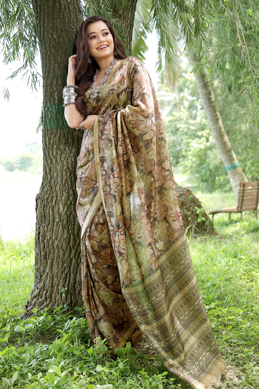Accompanied by a matching coffee-toned blouse in cotton silk, the ensemble maintains a seamless look while leaving room for personalized styling with statement accessories or creative blouse designs.