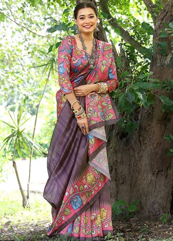 The saree features a rich coffee-hued solid body, lending it a warm, sophisticated look. This neutral tone is thoughtfully paired with a vibrant printed pallu, which introduces a splash of color and artistry to the ensemble. The play between the subdued body and the expressive pallu adds dimension and character, making it suitable for work, casual gatherings, or festive day events.