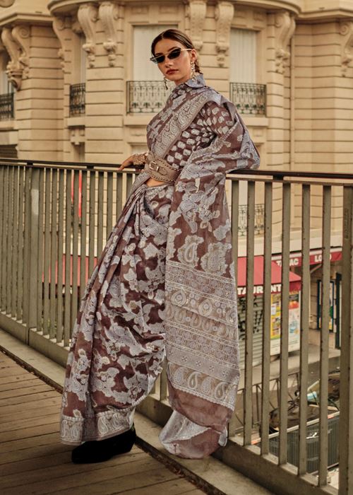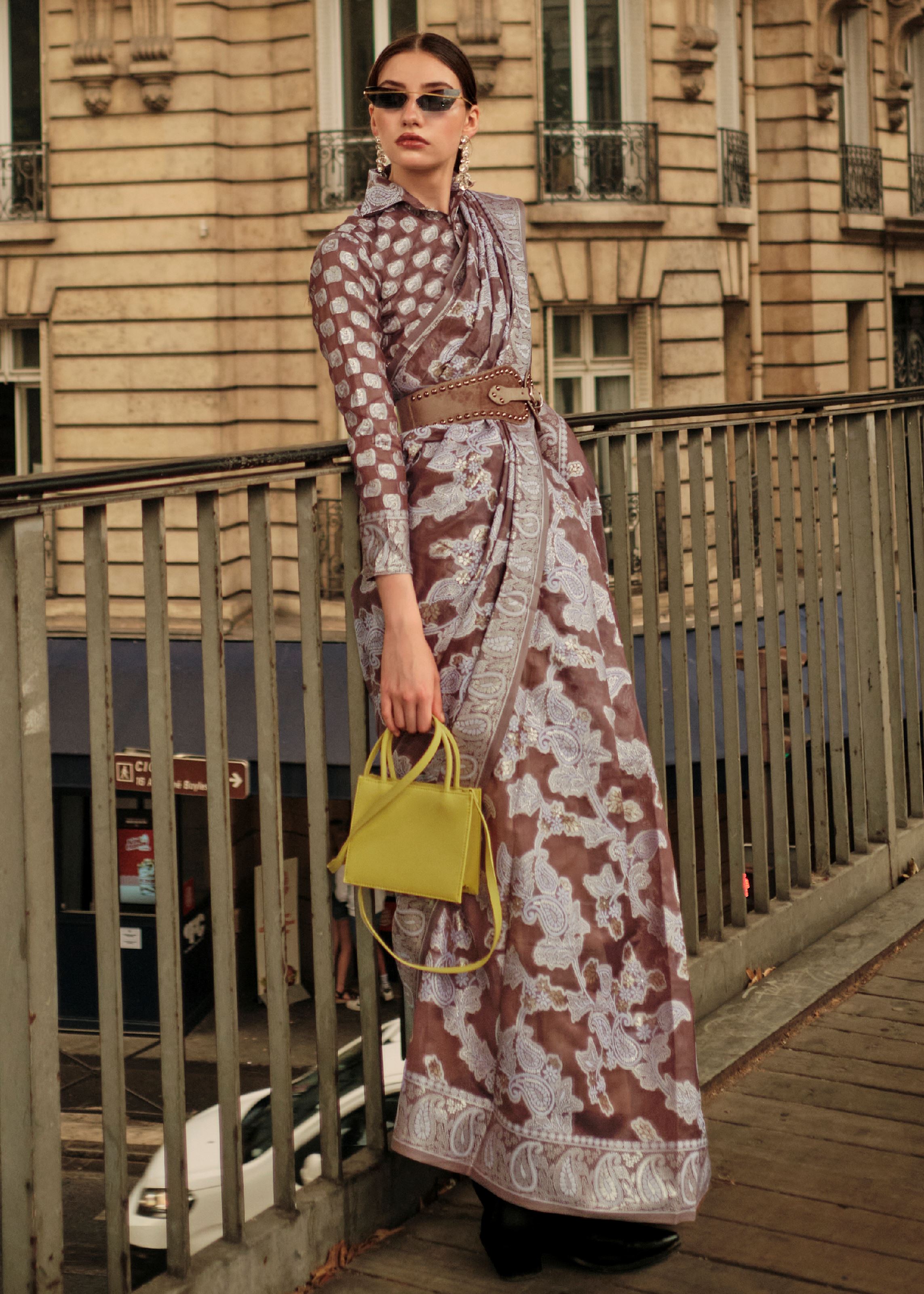 Coffee Organza Saree With Jacquard Woven Chikankari Work