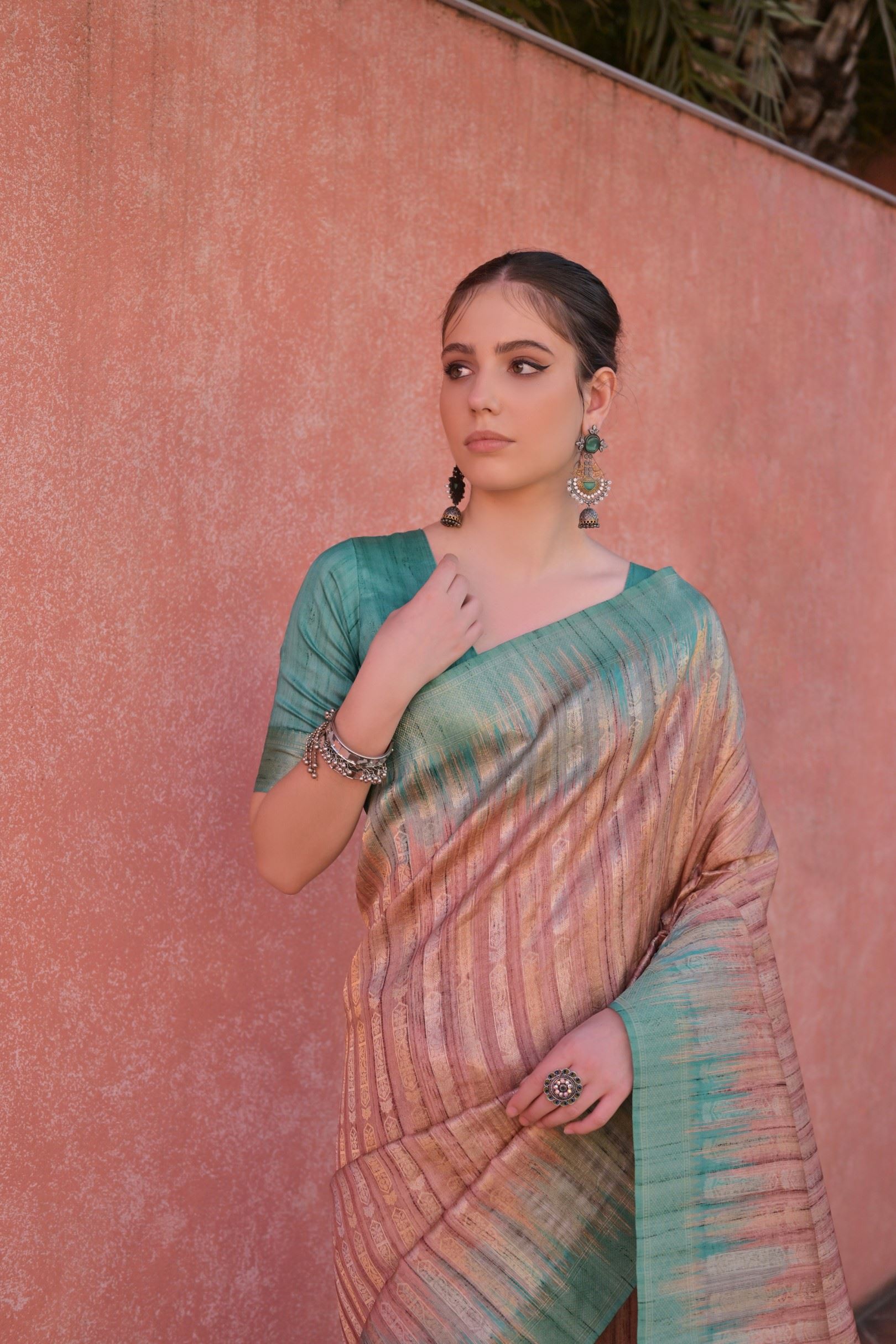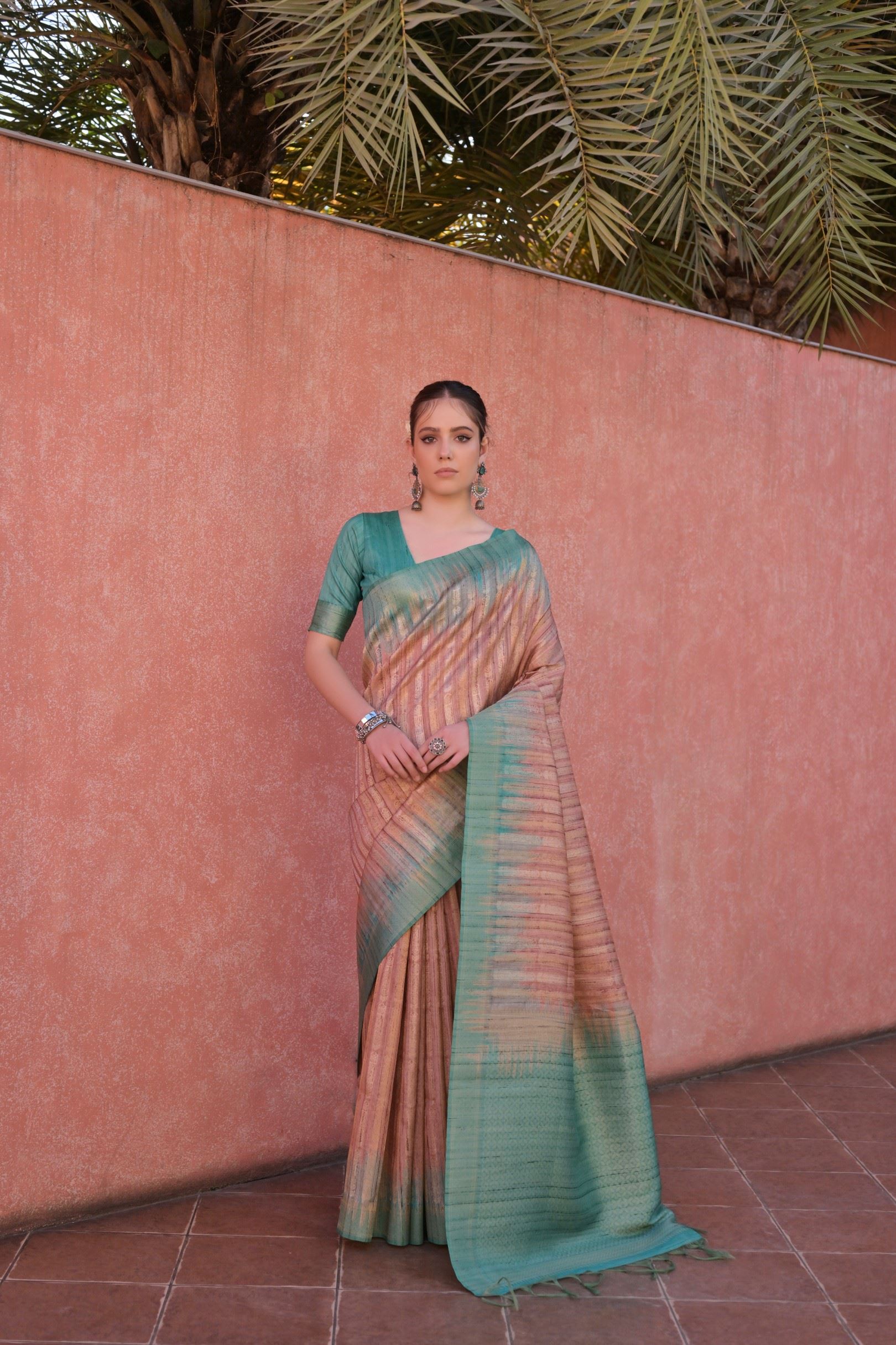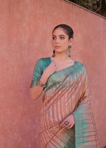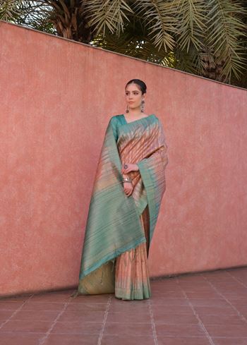Adding a refreshing twist is the contrast pallu in striking rama green, which brings a vibrant pop of color to the overall look. This contrast is further echoed in the Rama Tussar silk blouse, creating a coordinated yet eye-catching ensemble.