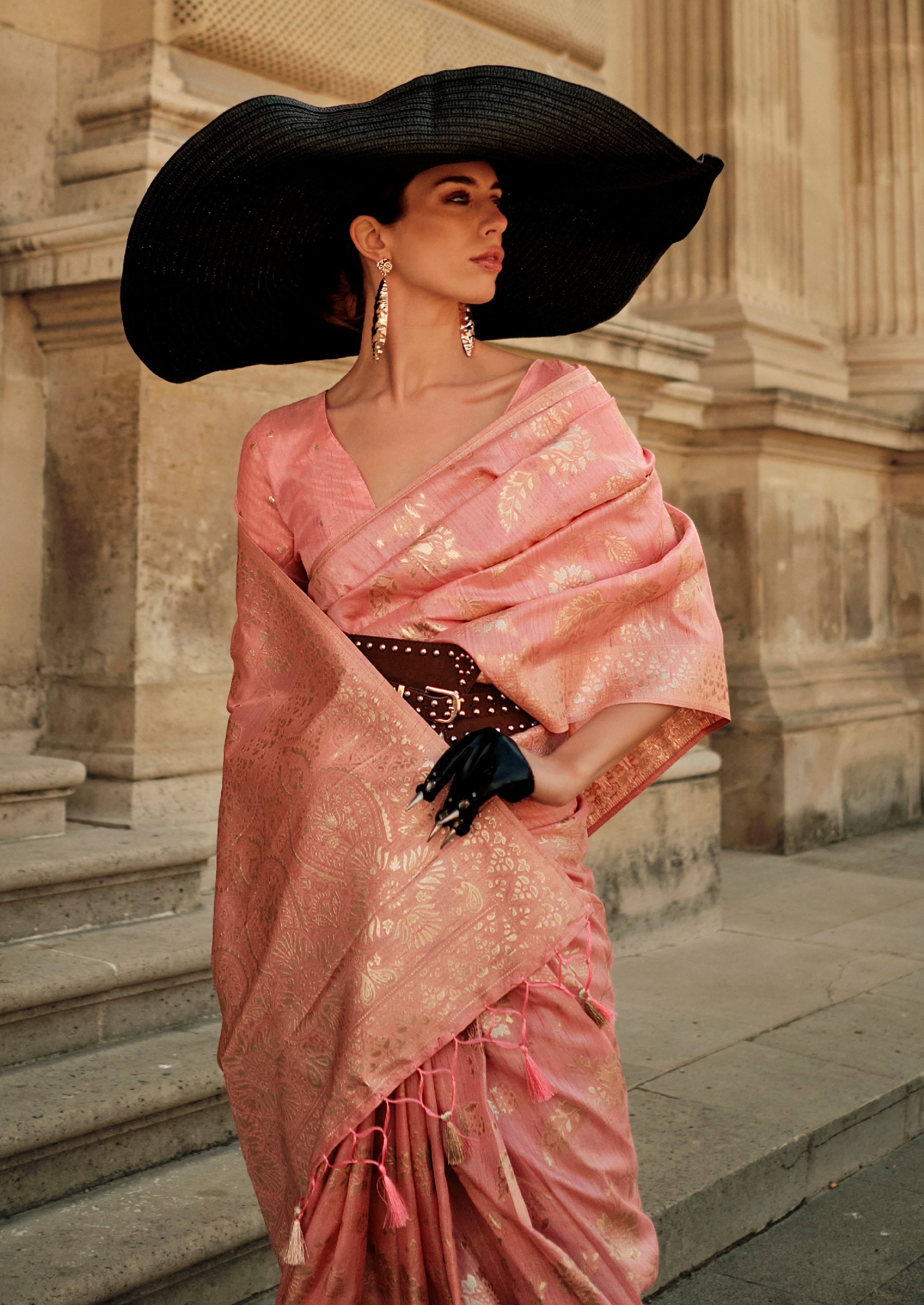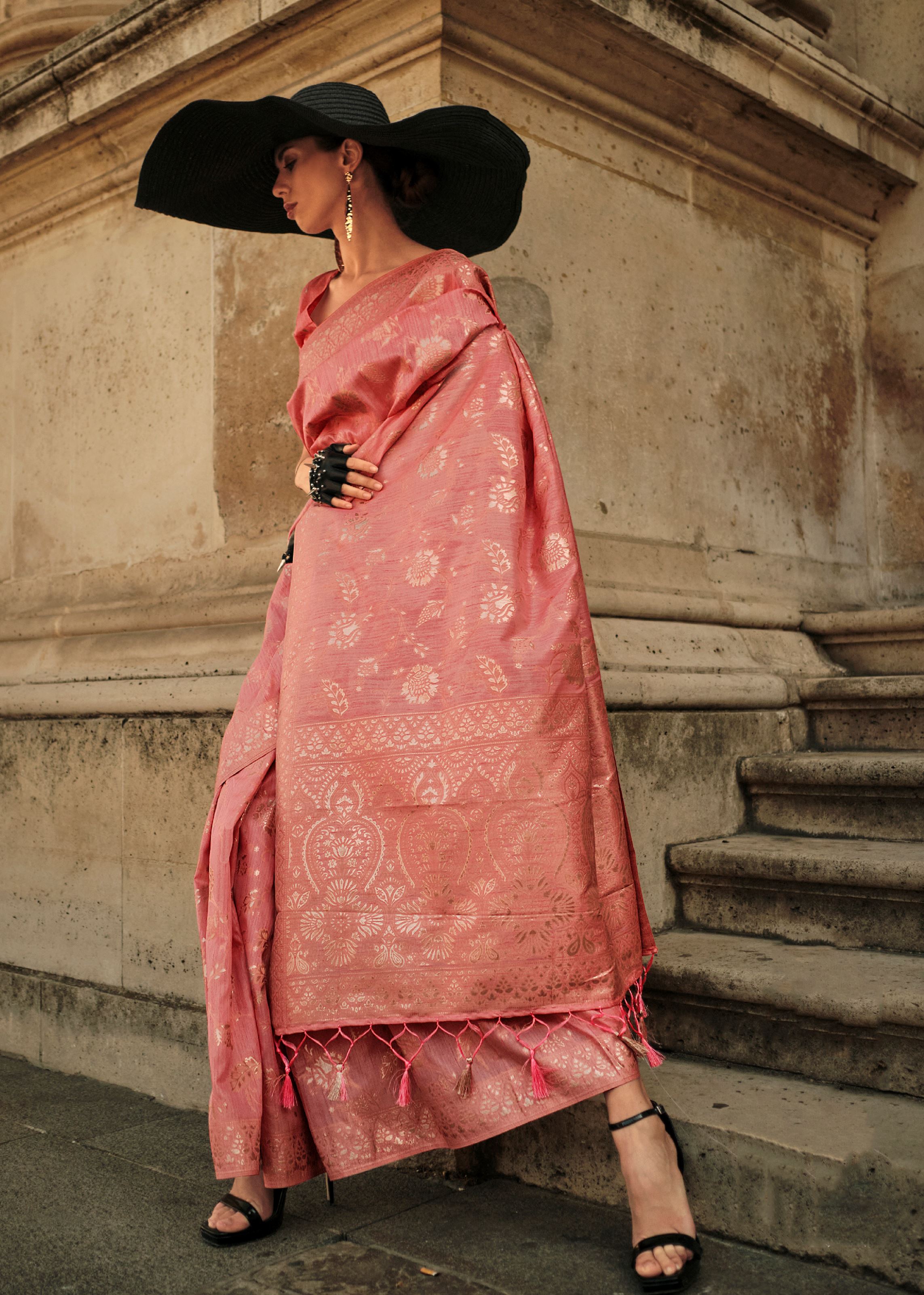 Coral Gota Zari Weaving Silk Saree With Woven Work