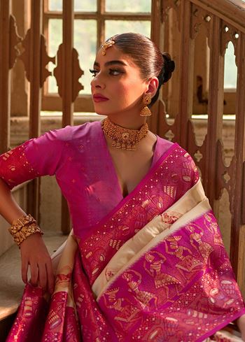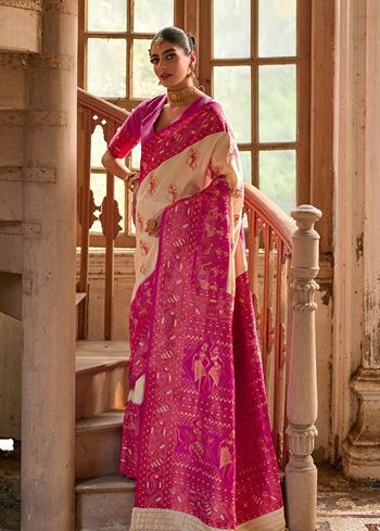 Cream & Pink Banarasi Silk Saree with Kalamkari Zari Design