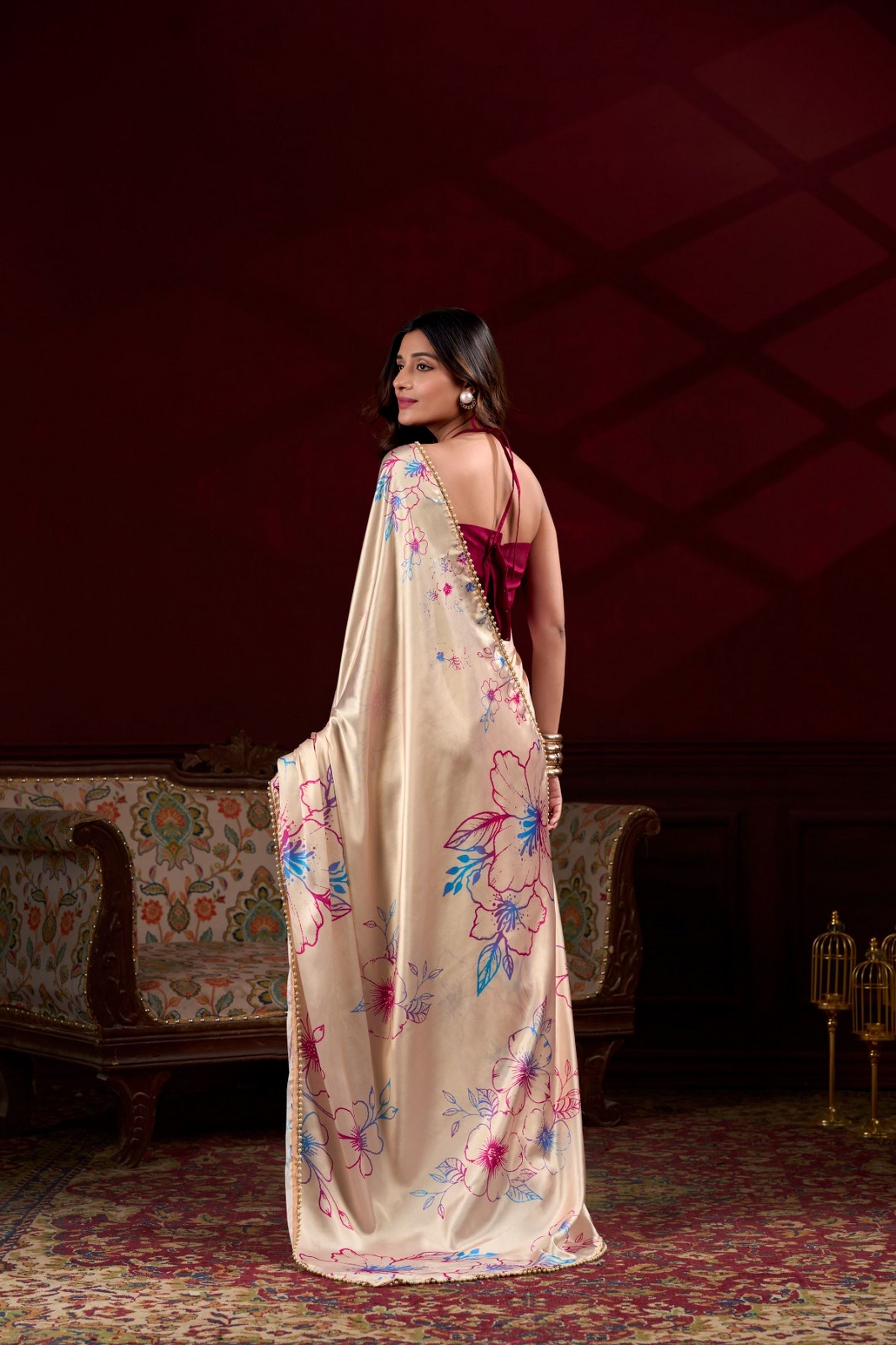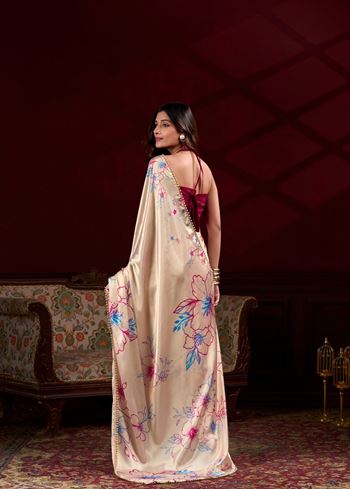 Cream Beautiful Floral Printed Japan Satin Silk Graceful Evening Party Saree