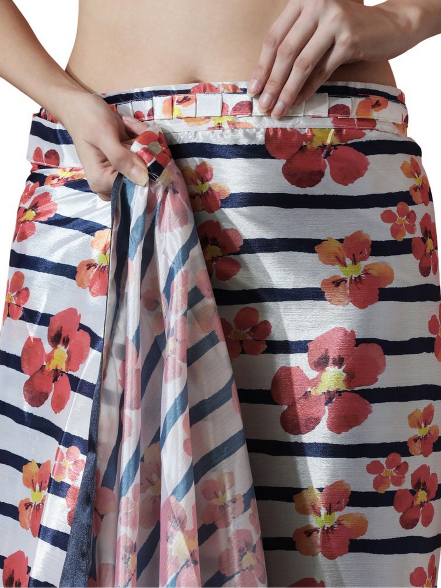 Adding to its appeal is the delicate lace border, which enhances the saree with a subtle touch of sophistication. Designed in a ready-to-wear style with pre-stitched pleats, this saree saves you time and effort, making draping quick and flawless without compromising on elegance.