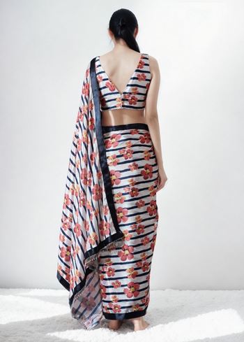 Cream Chinnon Digital Print & Lace Border Trendy Ready To Wear Saree