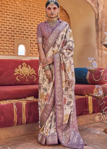 This ensemble is paired with a beautifully contrasting mauve PV silk blouse that enhances the saree's overall charm with a refined color pairing. The floral print adds just the right amount of contemporary detailing, making the saree both versatile and stylish—perfect for women who appreciate effortless elegance in their ethnic attire.