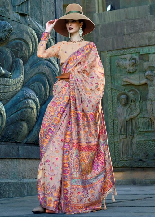 Cream Handloom Organza Saree With Handloom Kashmiri Jacquard Woven Work