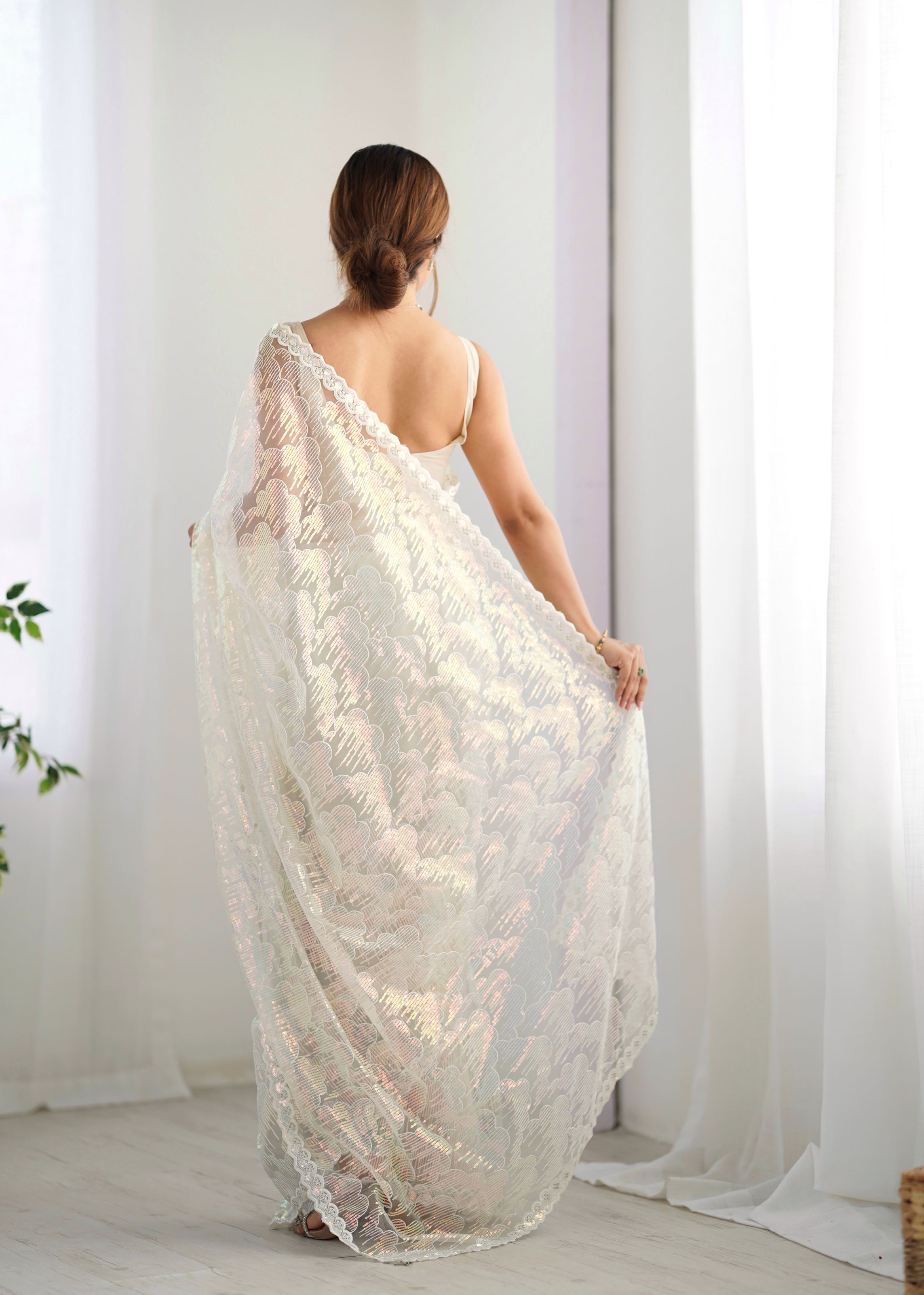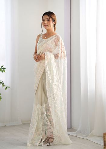 The saree is paired with a matching cream art silk blouse, highlighted with embroidered detailing to perfectly complement the sequins work on the drape. Together, the blouse and saree create a refined and coordinated look, offering the ideal balance of traditional charm and modern designer appeal. The elegant cream tone with sparkling sequins ensures you stand out gracefully at every celebration.