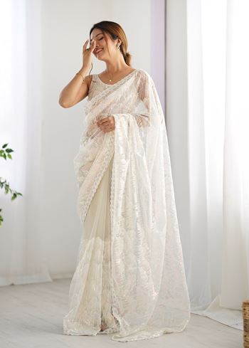 Cream Mono Net Beautiful Bollywood Saree With Designer Sequins Work