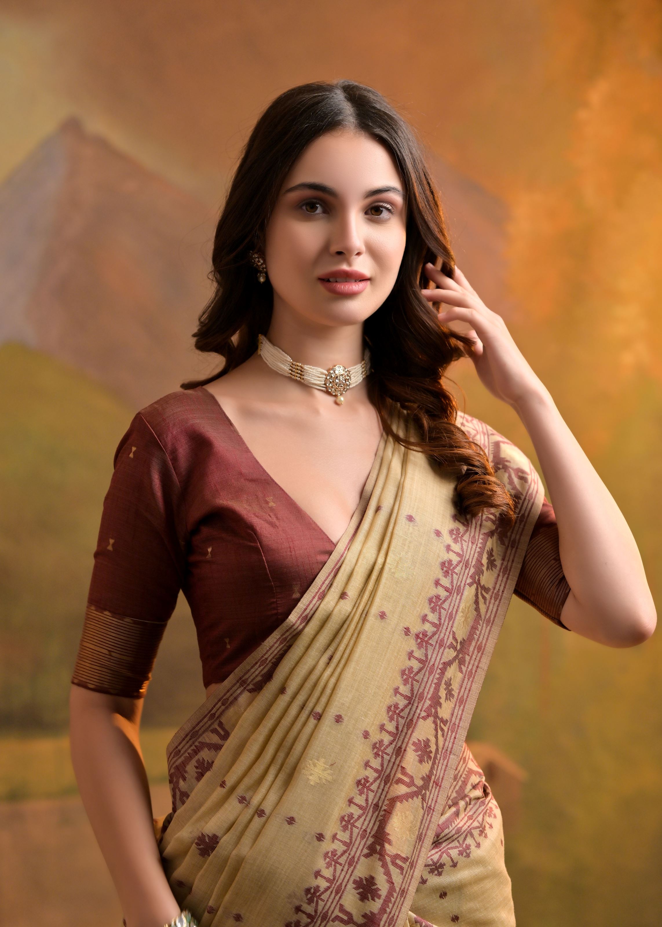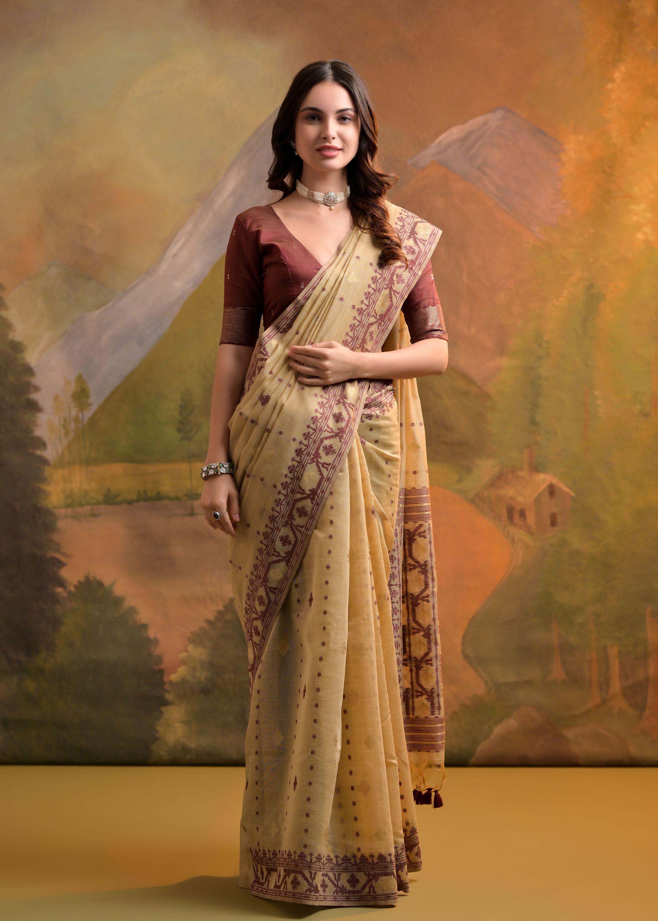 The serene cream base serves as a soft canvas for intricate thread buttis that add quiet texture and charm to the drape. Paired with a deep coffee-colored blouse crafted from the same Muga cotton, the contrast adds richness while keeping the look grounded and classic. This saree is an embodiment of everyday luxury—effortlessly stylish and deeply rooted in heritage.