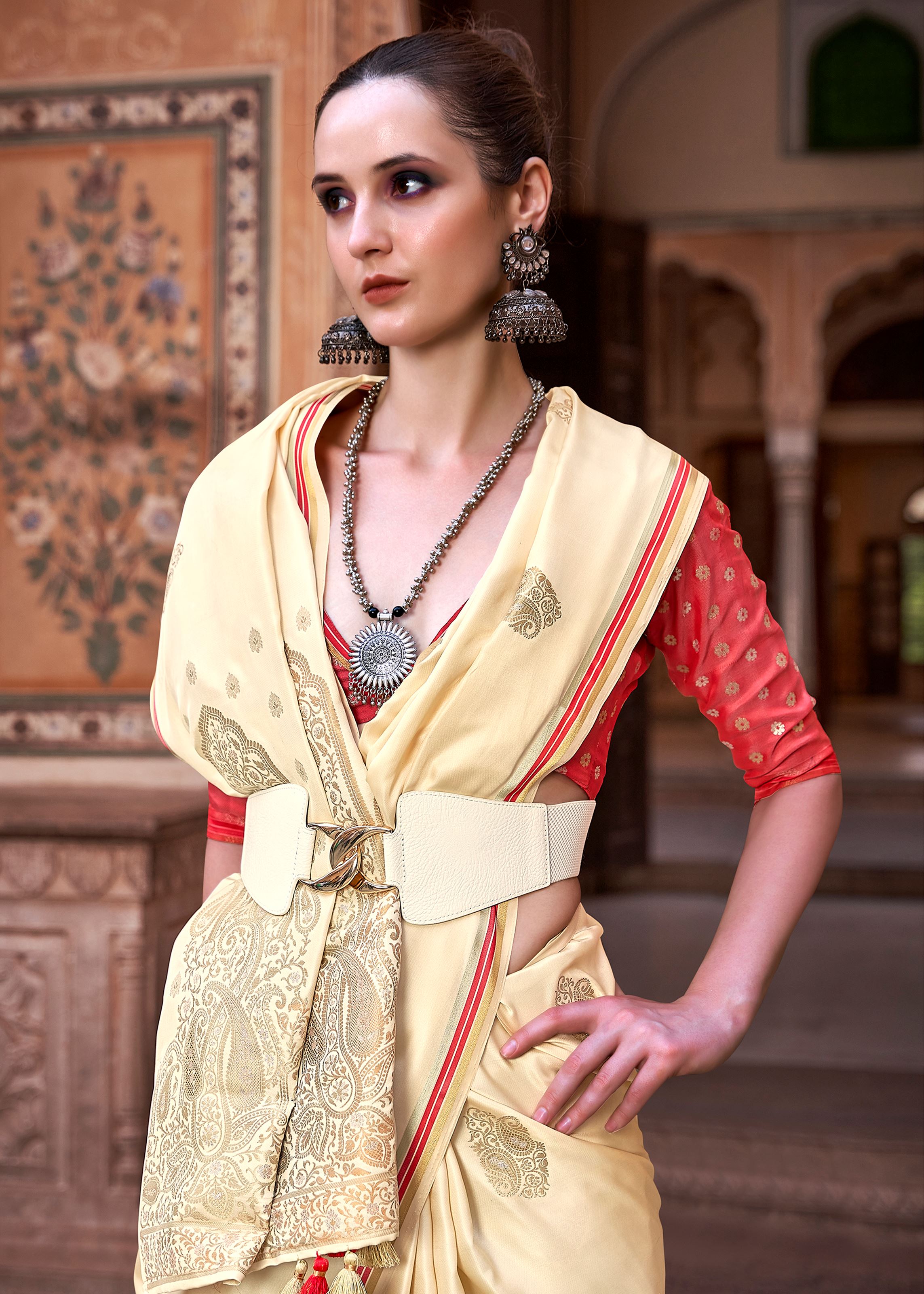 Cream Pure Satin Silk Saree With Woven Zari Work