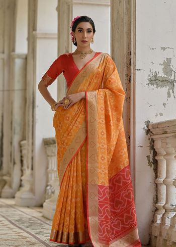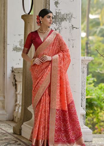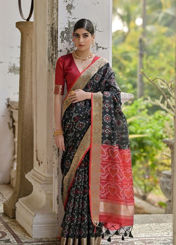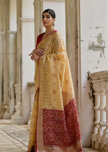 Made from luxurious raw silk, this saree features a serene cream base highlighted with traditional Ikkat-inspired motifs, offering a refined yet artistic visual texture. The vibrant red contrast pallu adds a striking pop of colour, making the ensemble perfect for both traditional and contemporary occasions. Complemented with a matching red raw silk blouse, it balances elegance with bold appeal.