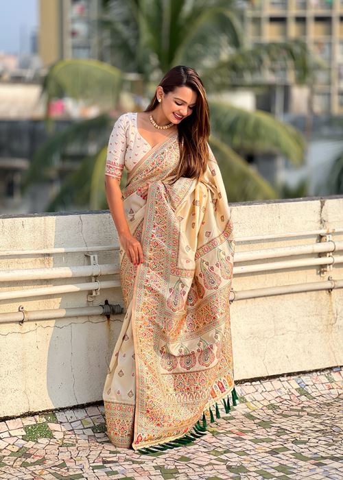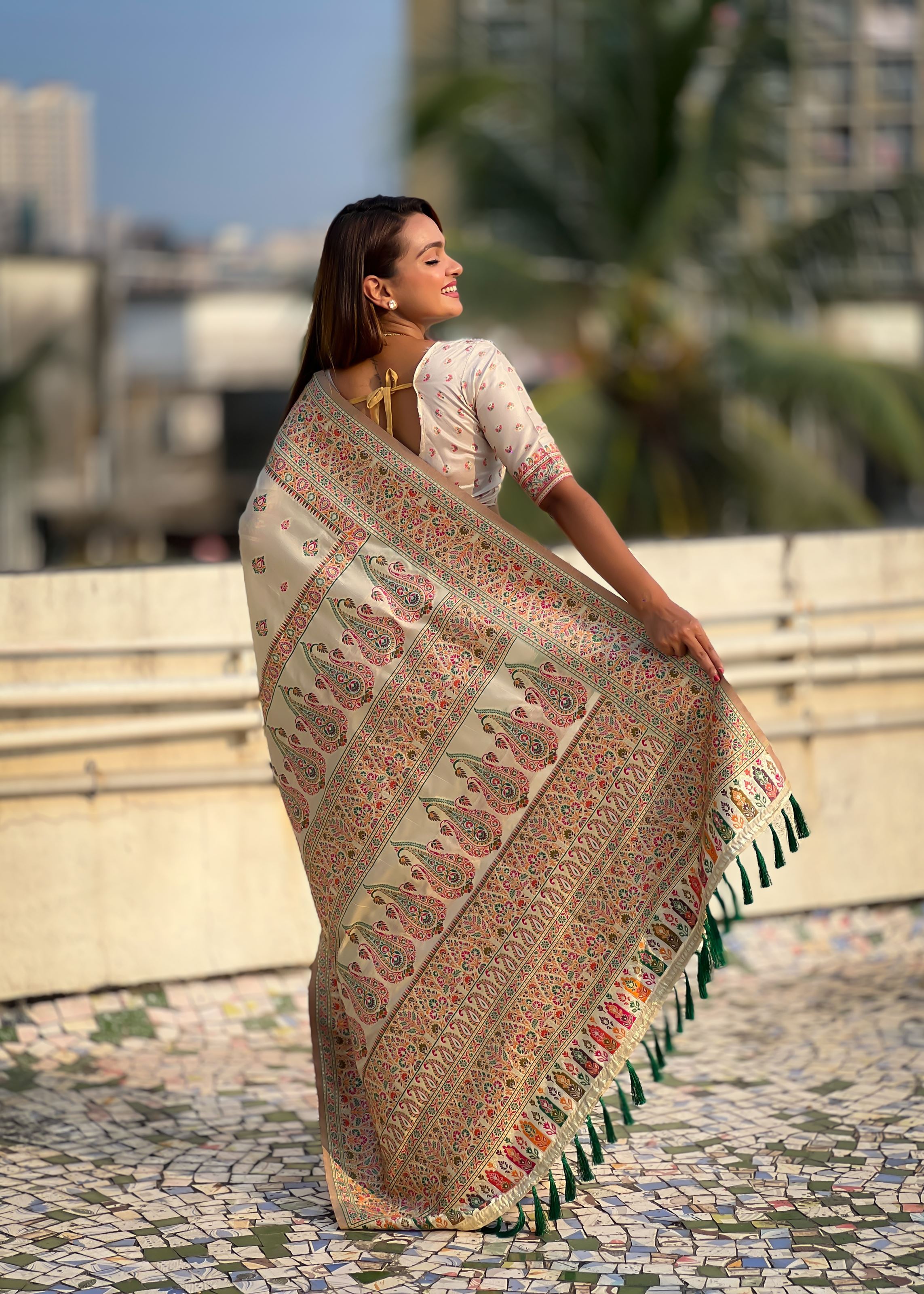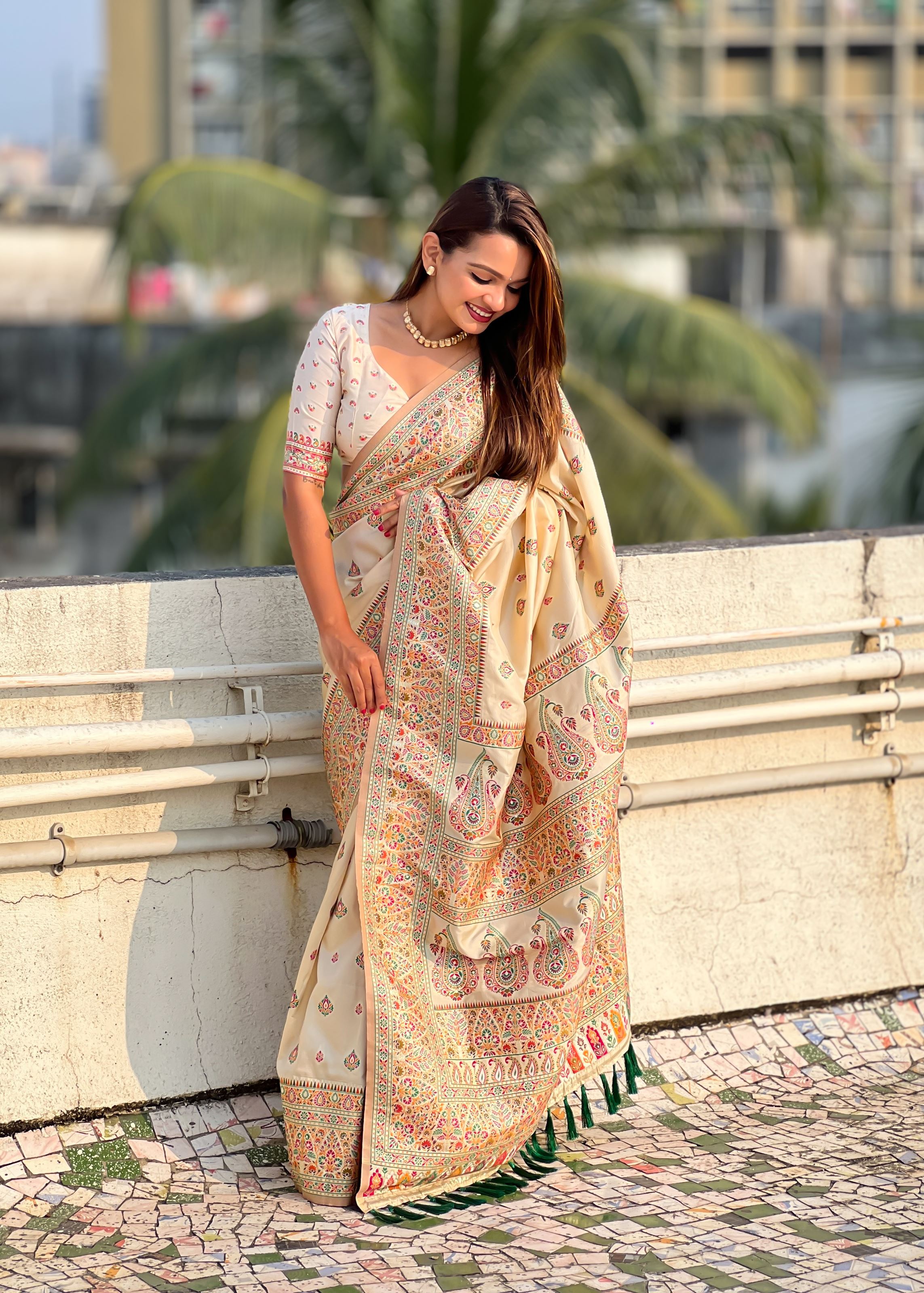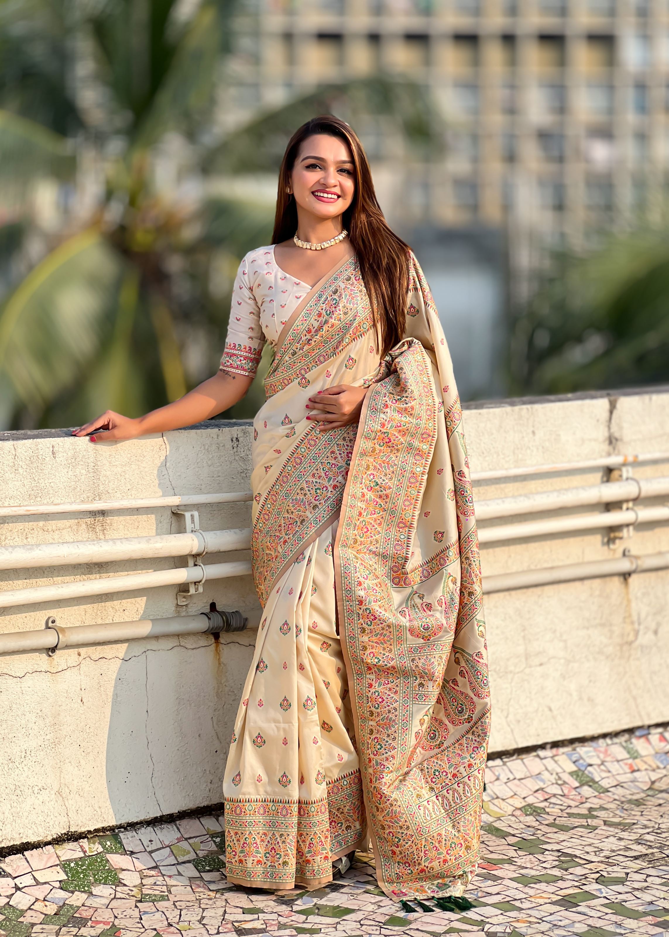 Cream Silk Blend Saree With Meenakari Kashmiri woven Work