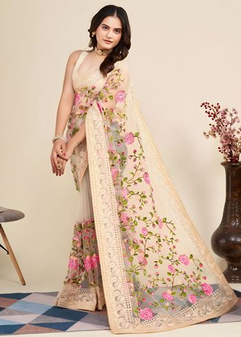 Cream Soft Net Saree with C Pallu Chikankari Embroidery Work