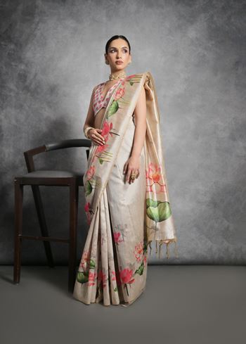 Cream Soft Tussar Silk Saree with Print and Small Zari Border