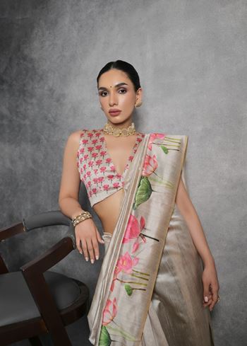 The gentle cream hue sets a soothing tone, while delicate printed patterns add visual interest with a refined, minimalist touch. A small zari border lends just the right amount of traditional glamour, creating a balanced look that is timeless and graceful.