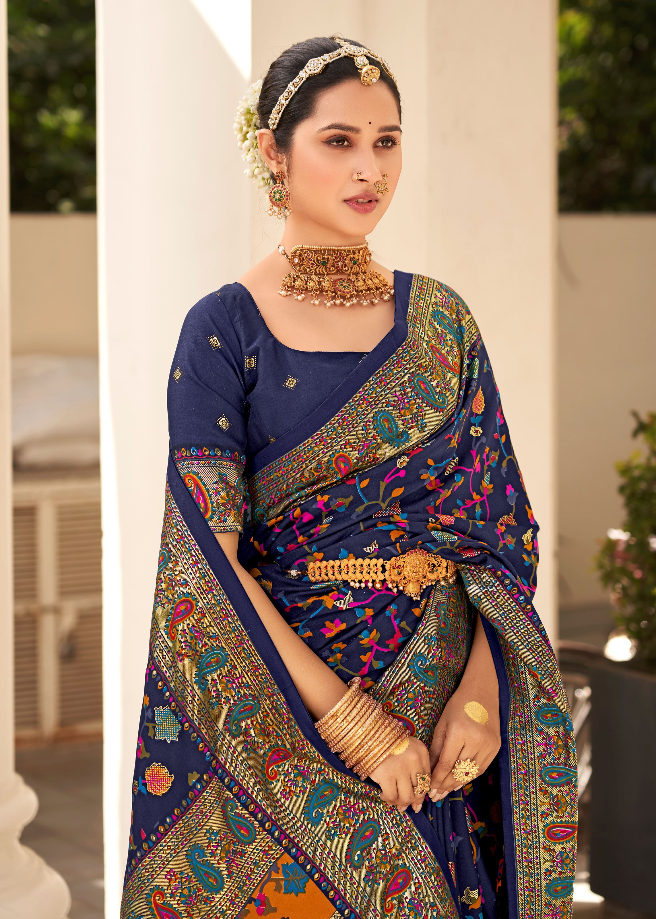 Paired with a matching dark blue silk blend blouse, this saree forms a harmonious and stylish ensemble. Its lightweight yet rich texture ensures effortless draping while maintaining a polished and majestic appearance. The intricate woven craftsmanship highlights traditional artistry, while the floral prints add a modern touch. Versatile and elegant, this saree can be styled with statement jewelry for evening events or subtle accessories for daytime celebrations.