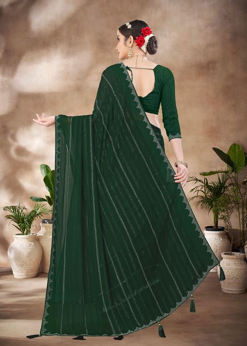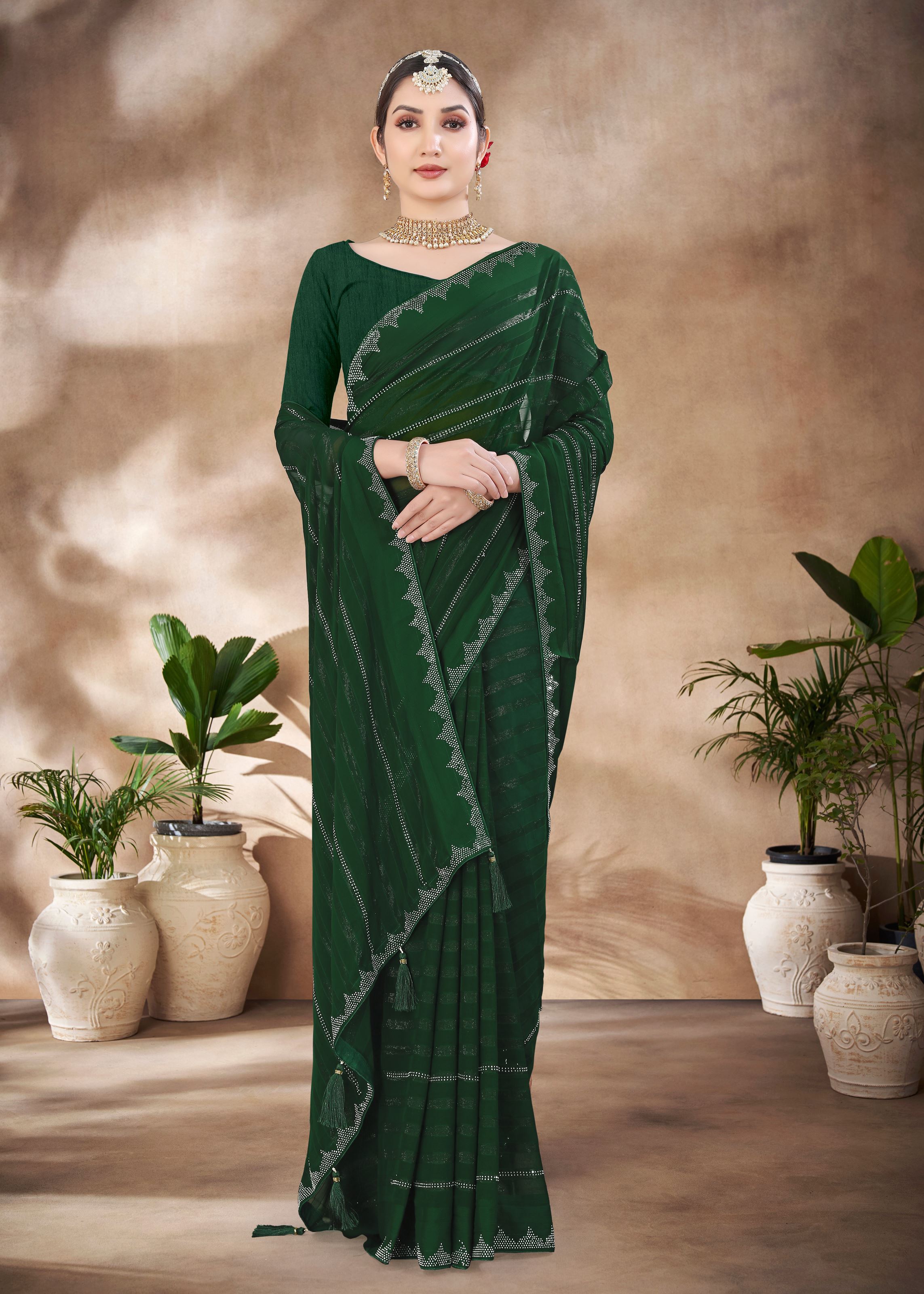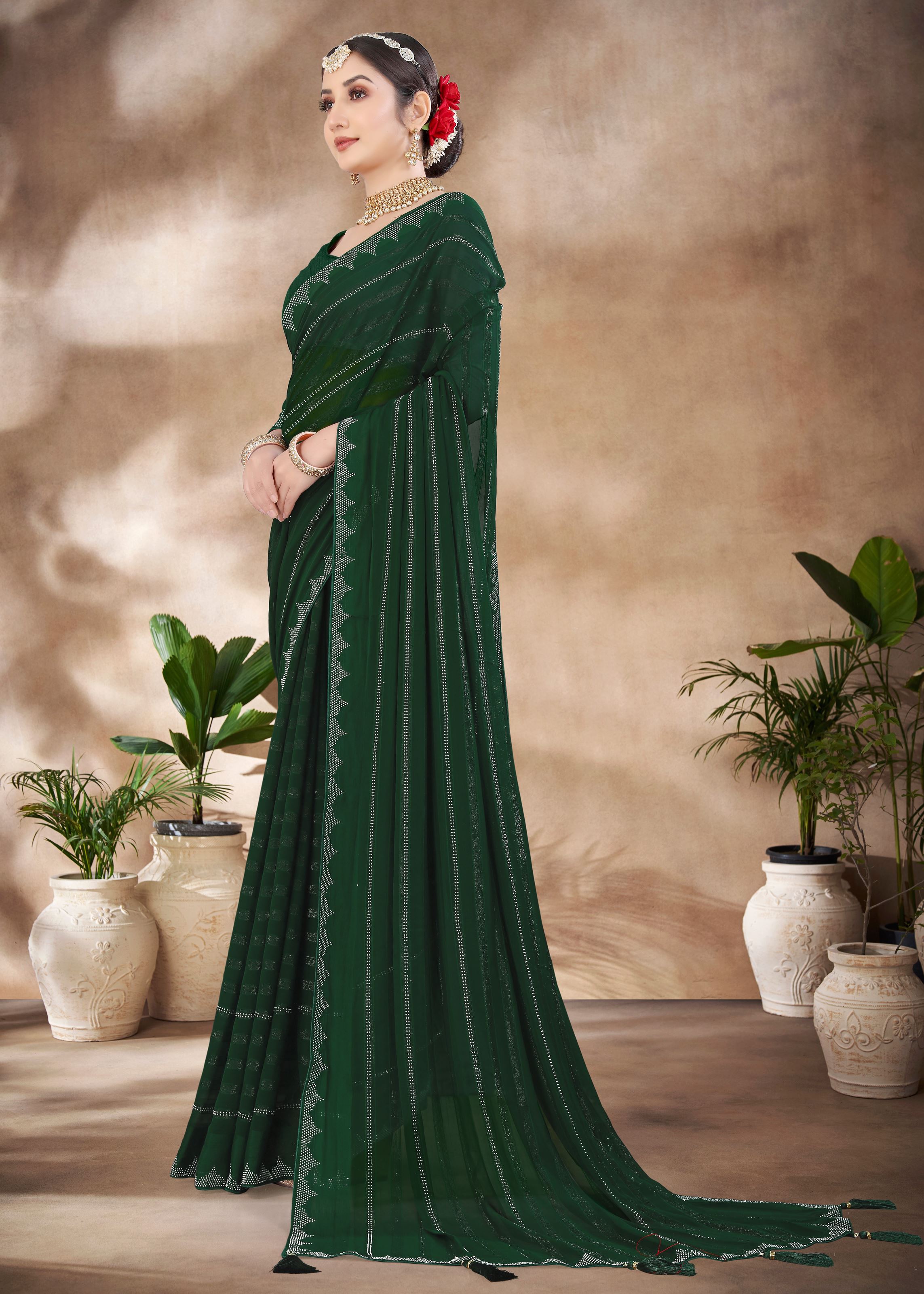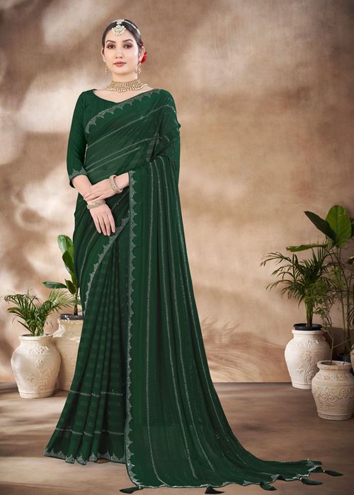 Dark Green Chiffon Saree With Swarovski Diamond Work